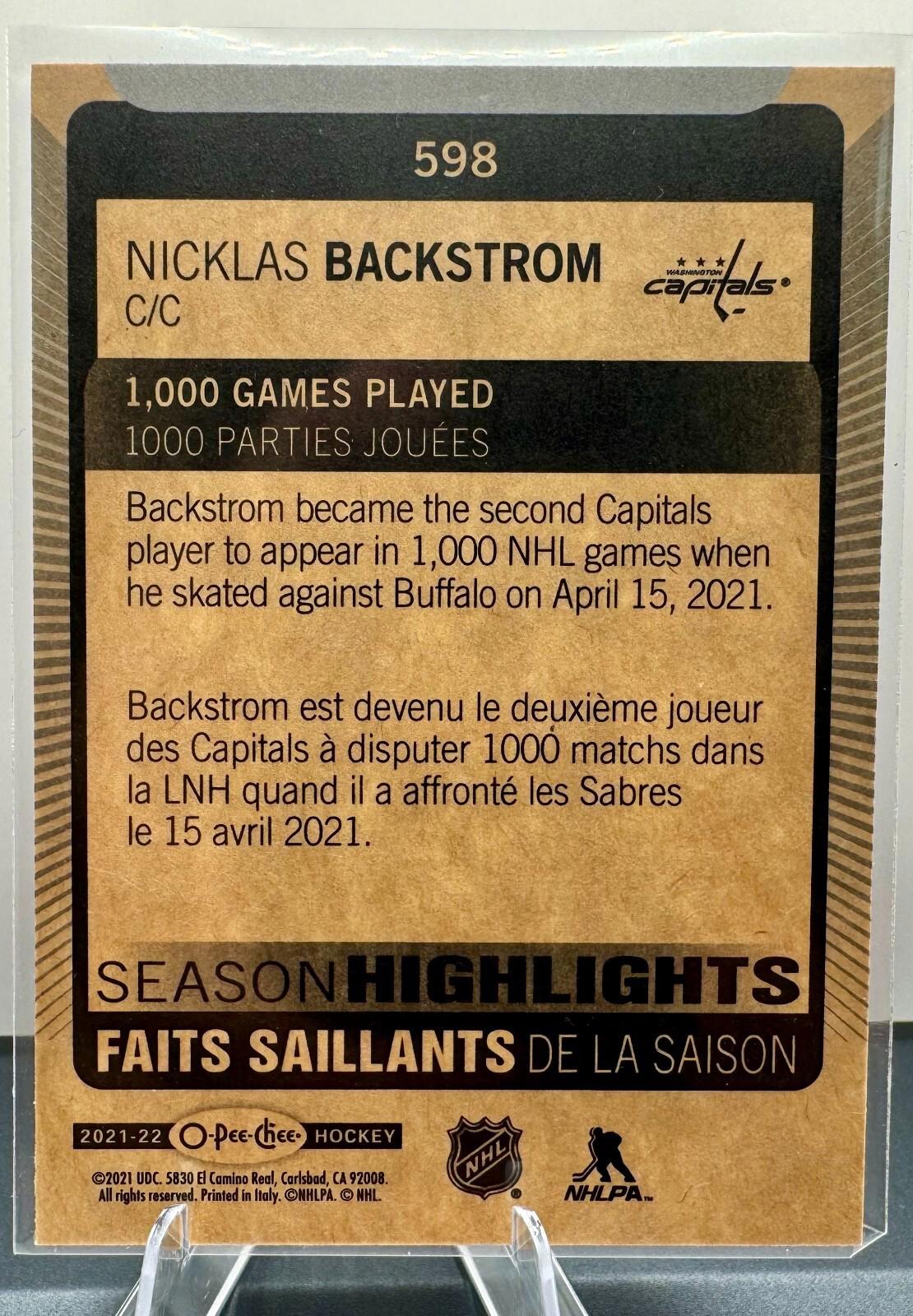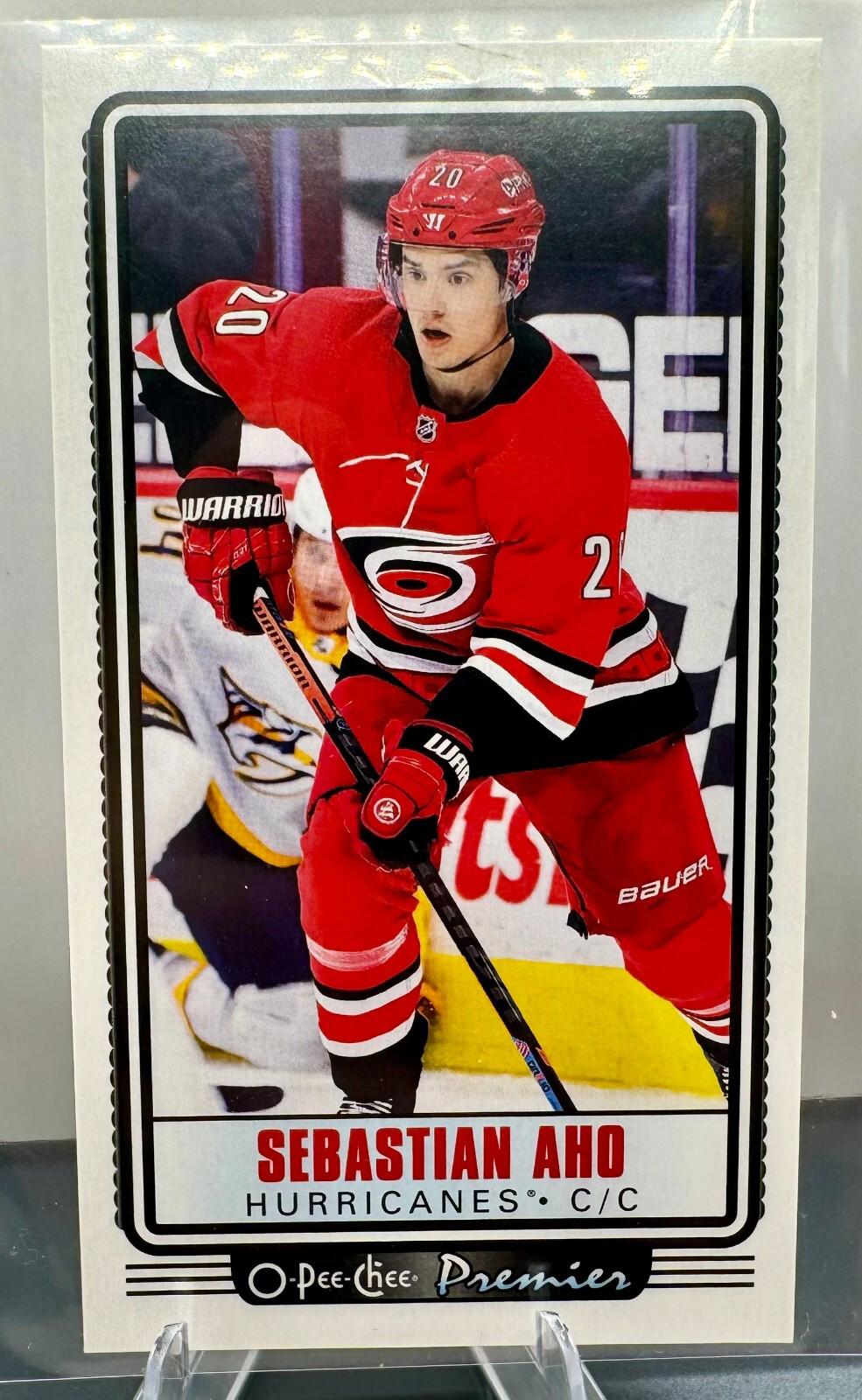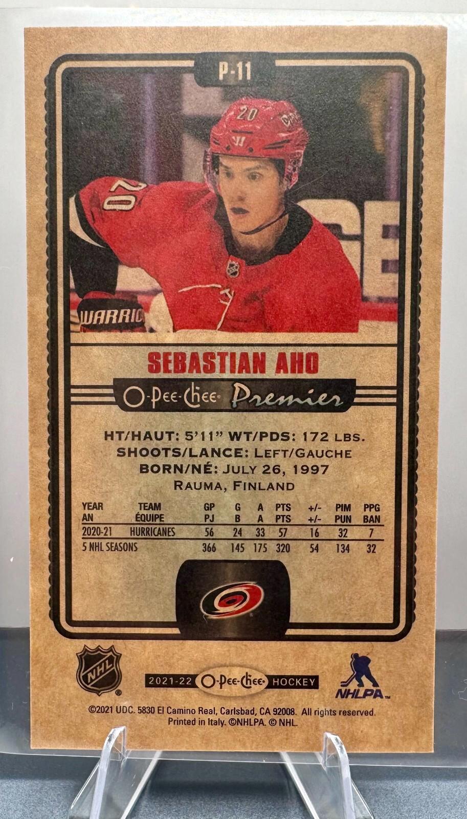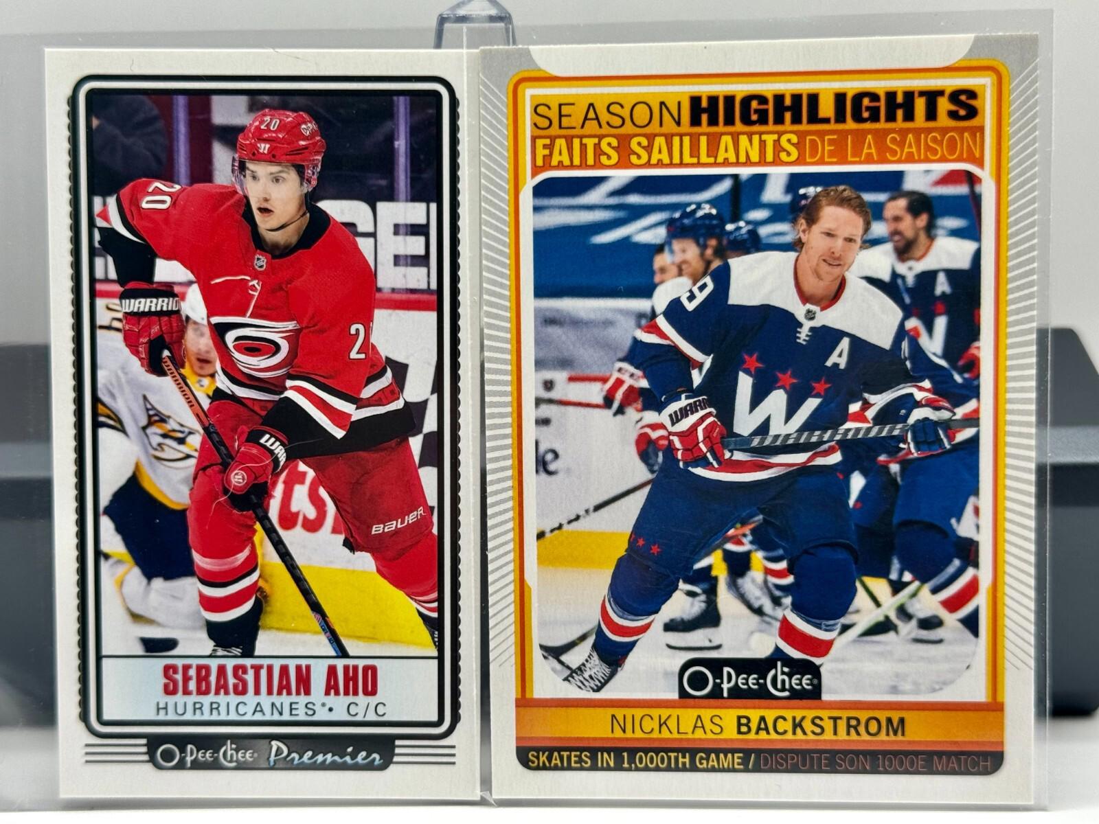 This lot of two 2021-22 O-Pee-Chee Hockey trading cards features exciting players from the National Football League (NFL) including Sebastian Aho and Nicklas Backstrom. The cards are part of the Blue Prizm and Green Prizm varieties and are perfect for collectors who love ice hockey.