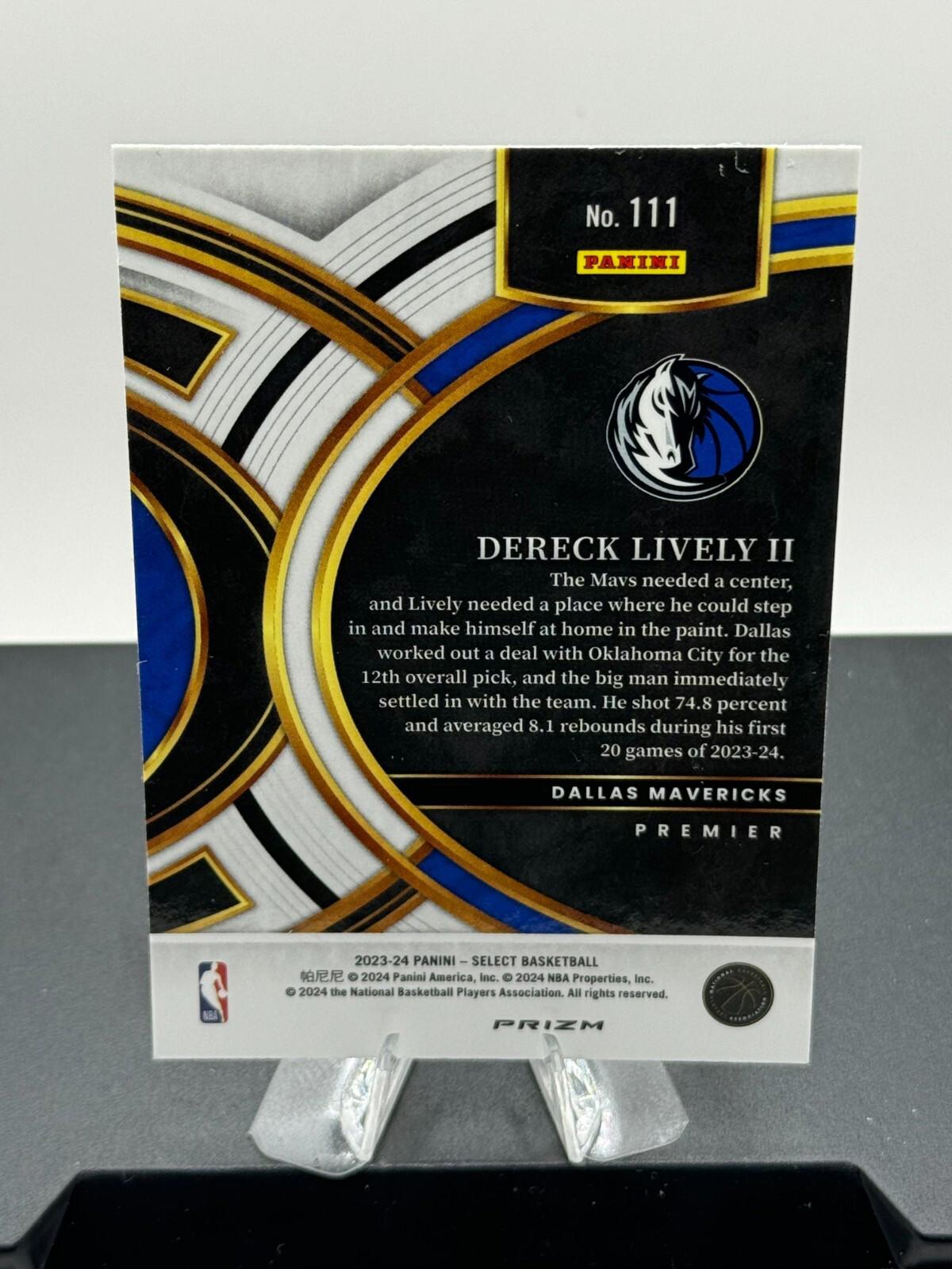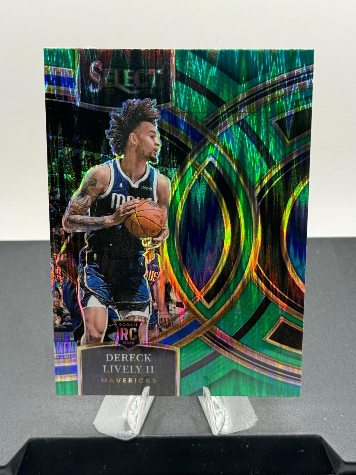This sports trading card is a must-have for any fan of the National Basketball Association (NBA). It features Dereck Lively, a rookie player from the Dallas Mavericks team. The card is part of the 2023-24 Panini Select set and has a card number of 111.The card is in standard size and has a green prizm parallel/variety. It is not autographed and is not vintage. The card is in English language and was manufactured in the United States by Panini. This card is a great addition to any collection and is perfect for fans of basketball.