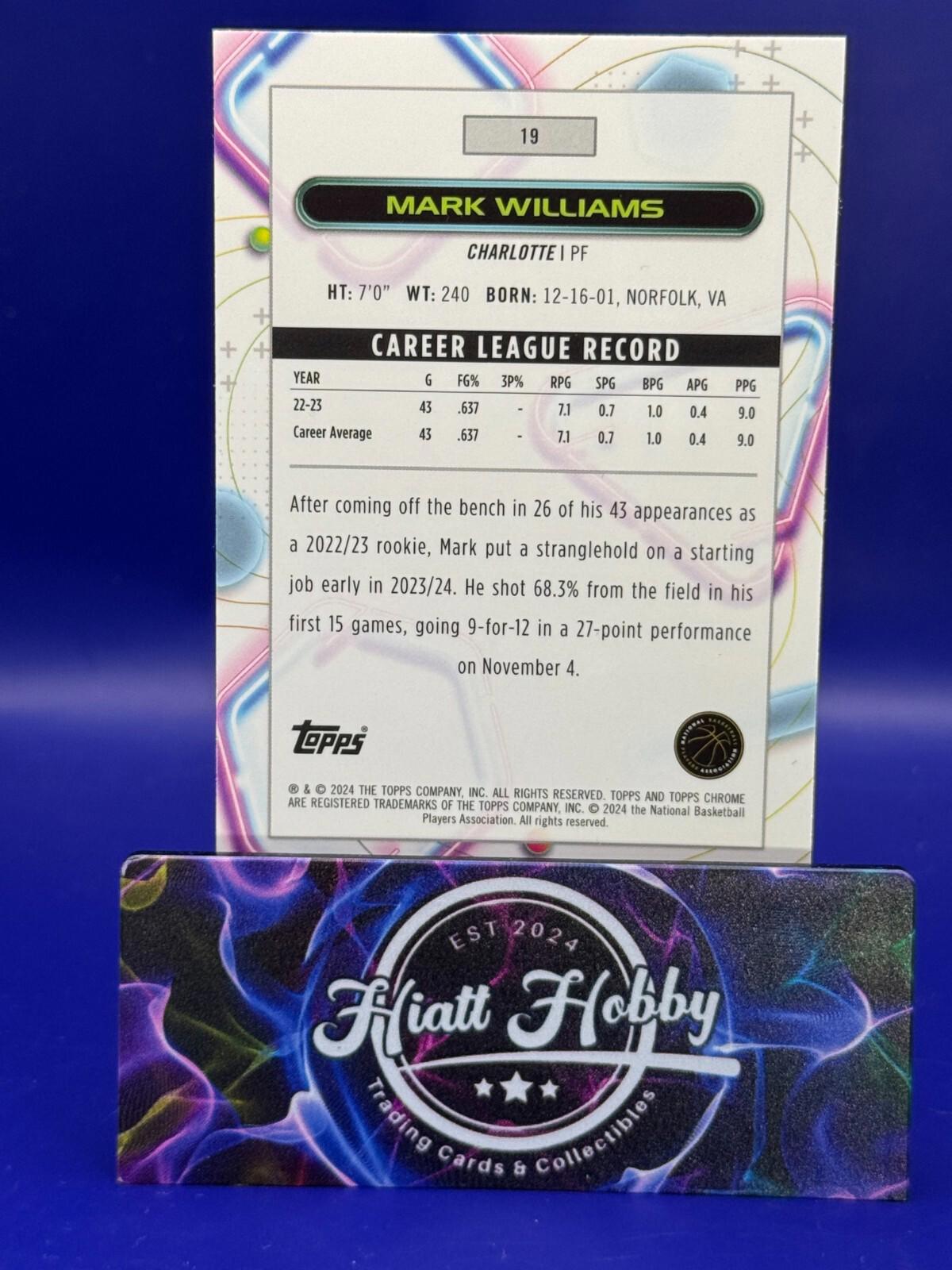 Elevate your basketball card collection with the 2023-24 Topps Cosmic Chrome Mark Williams Green Nucleus card. This limited edition piece, numbered to just 75, captures the essence of the up-and-coming Charlotte Hornets star in a stunning green parallel variety. As part of the highly sought-after 2023 Topps Cosmic Chrome set, this card is a must-have for both die-hard fans and serious collectors.Crafted with quality in the United States, this sports trading card features serial numbering, adding a unique touch to its collectibility. It's presented in English and maintains the standard card size for seamless integration into your collection. While it's not autographed, its rarity and the exclusivity of the Green Nucleus parallel make it a standout addition.