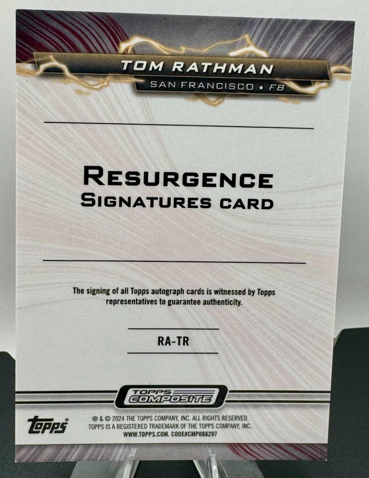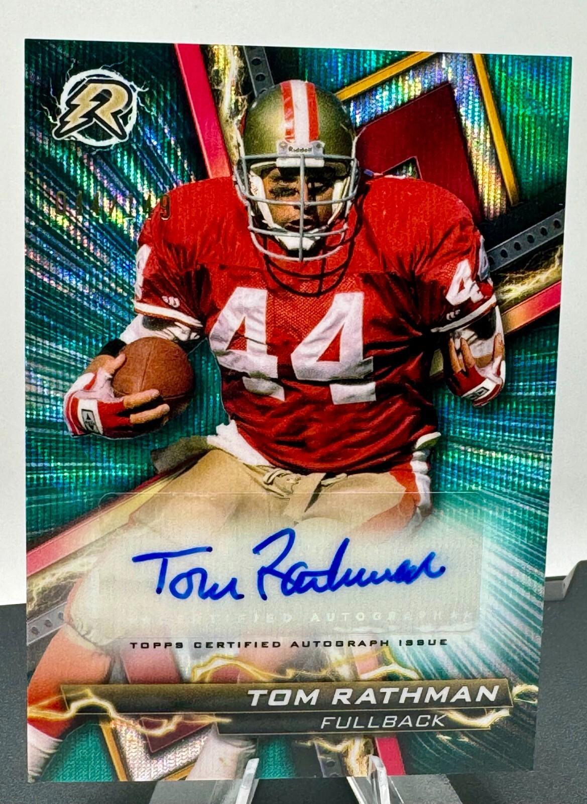 This 2023 Topps Composite Football trading card features an autographed Teal Surge Refractor Auto parallel variety of Tom Rathman, signed by the San Francisco 49ers player himself. The card is also serial numbered and is a chase for avid collectors. The card is a standard size and manufactured by Topps in the United States. It features an English language label or sticker autograph format and is authenticated by Topps. This card is a great addition to any NFL or sports trading card collection, especially for fans of the San Francisco 49ers and collectors of rare and unique cards.
