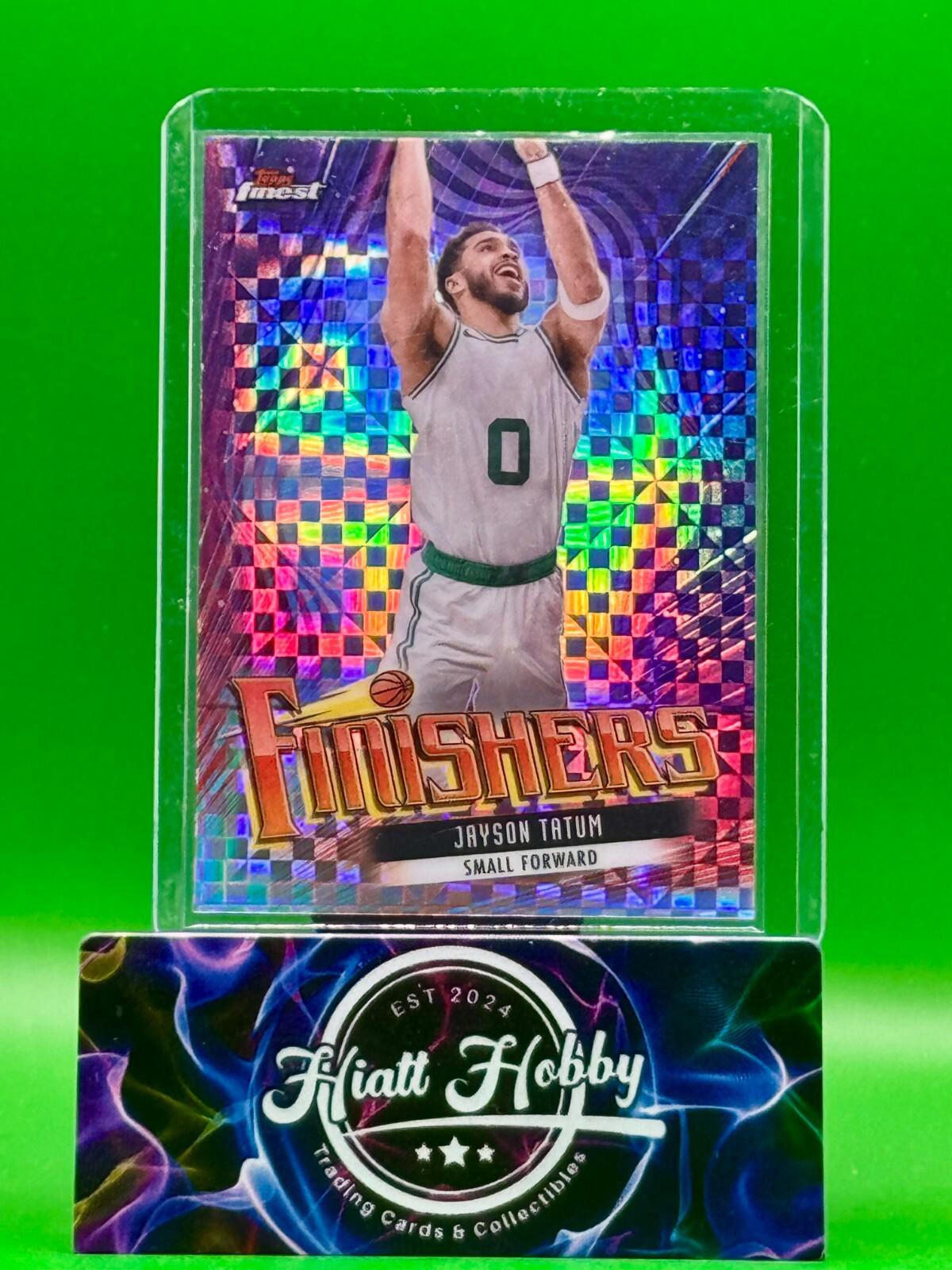 Elevate your basketball card collection with the 2023 Topps Finest Jayson Tatum #F-3 card, showcasing the Boston Celtics star in the prestigious Finishers X-Fractor variety. As part of the highly sought-after 2023-24 Topps Finest set, this card captures the essence of the NBA Finals with its stunning design and reflects the skill and poise of the player himself.Crafted in the United States, the card is a standard-sized piece of premium card stock, ensuring durability and a classic feel. Not autographed, this original release is a must-have for enthusiasts of the sport and collectors alike, symbolizing both the contemporary spirit of basketball and the heritage of the game.