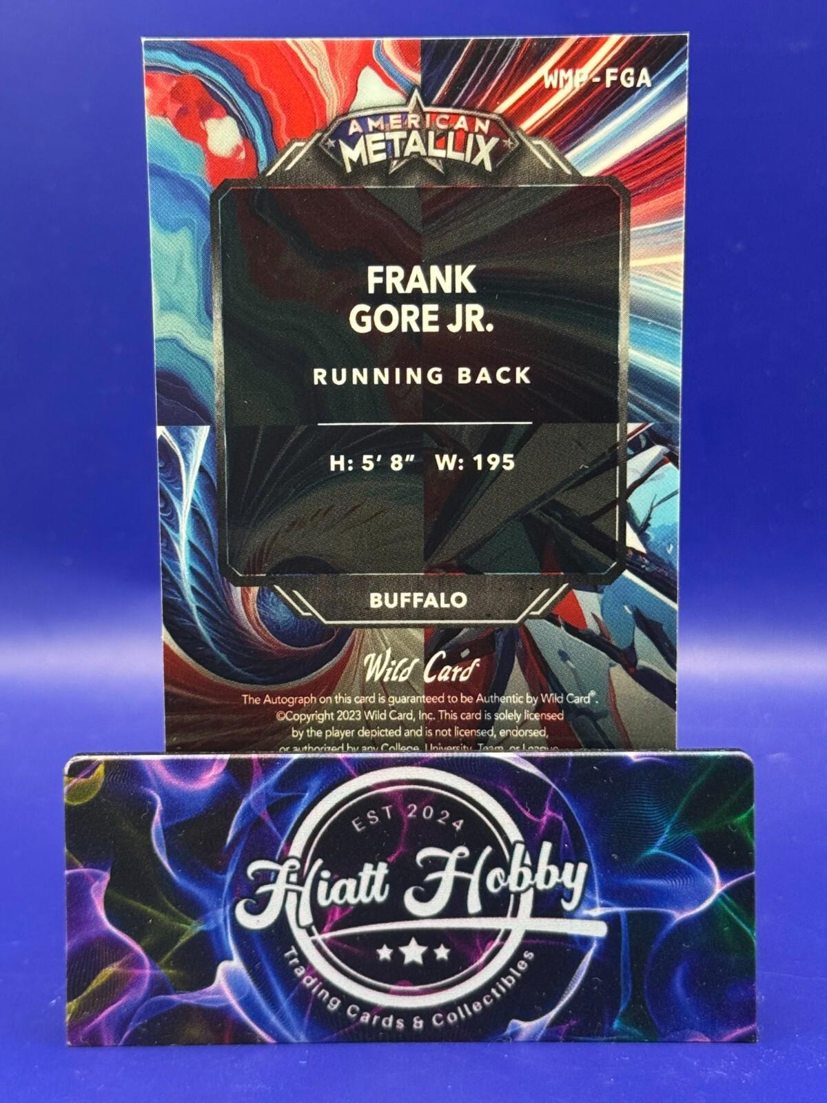 Capture a piece of football history with the 2023 Wild Card American Metallix Football card featuring rookie Frank Gore Jr. of the Buffalo Bills. This exclusive collectible, with its limited print run of just five, is a must-have for enthusiasts and fans alike. Adorned in a striking blue parallel variety, it's a standout addition to any collection.The card is autographed by Frank Gore Jr. himself and comes with a label or sticker autograph format, ensuring authenticity. As an original issue from the 2023 season, it's a contemporary treasure, crafted from quality card stock, and proudly made in the United States. It's a fine piece for those who appreciate the legacy and ongoing legacy of NFL stars.