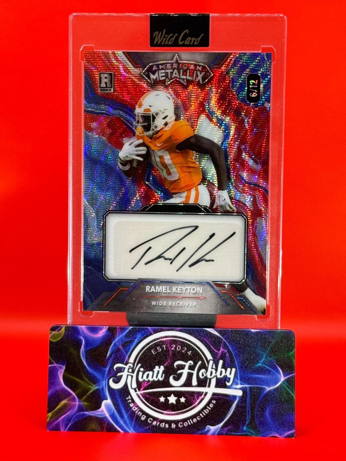 Elevate your collection with the 2023 Wild Card Metallix - Ramel Keyton #WMM-RKA Wave Auto /12, a standout piece showcasing the prowess of Las Vegas Raiders' up-and-comer Ramel Keyton. As a part of the esteemed WildMarble insert set, this card is not just a collectible but a slice of football history, complete with a Wave parallel that radiates exclusivity and design flair.Autograph enthusiasts will appreciate that this card is signed by Keyton himself, with the autograph authenticated via label or sticker, ensuring its legitimacy. Serial numbered to just 12, this rookie card is a mere handful, making it a coveted gem for NFL aficionados and collectors alike. Crafted in the United States, it represents the pinnacle of sports memorabilia from the 2023 NFL season.