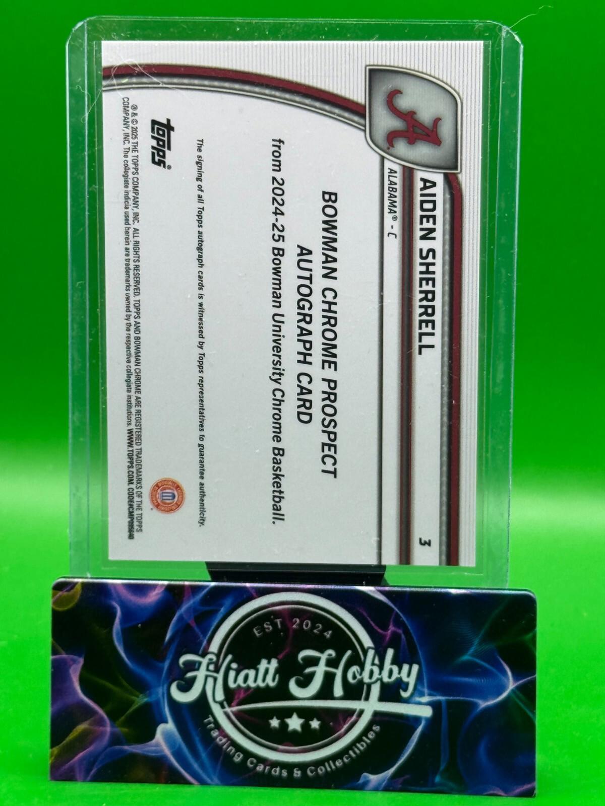 Capture a slice of collegiate basketball history with the 2024-25 Bowman University Chrome Basketball Aiden Sherrell #3 card, featuring the sought-after Green Shimmer Refractor parallel. This exclusive collectible showcases Aiden Sherrell, a standout player for the Alabama Crimson Tide, and is part of the illustrious 2023-24 Bowman University Chrome set. The card is autographed by Sherrell himself, authenticated by Bowman, and presented on premium card stock. As a rookie card with the NCAA stamp, it's a valuable find for any basketball enthusiast or card collector. Complete your collection with this English-language, United States-manufactured sports trading card and own a piece of the 2024-25 basketball season.