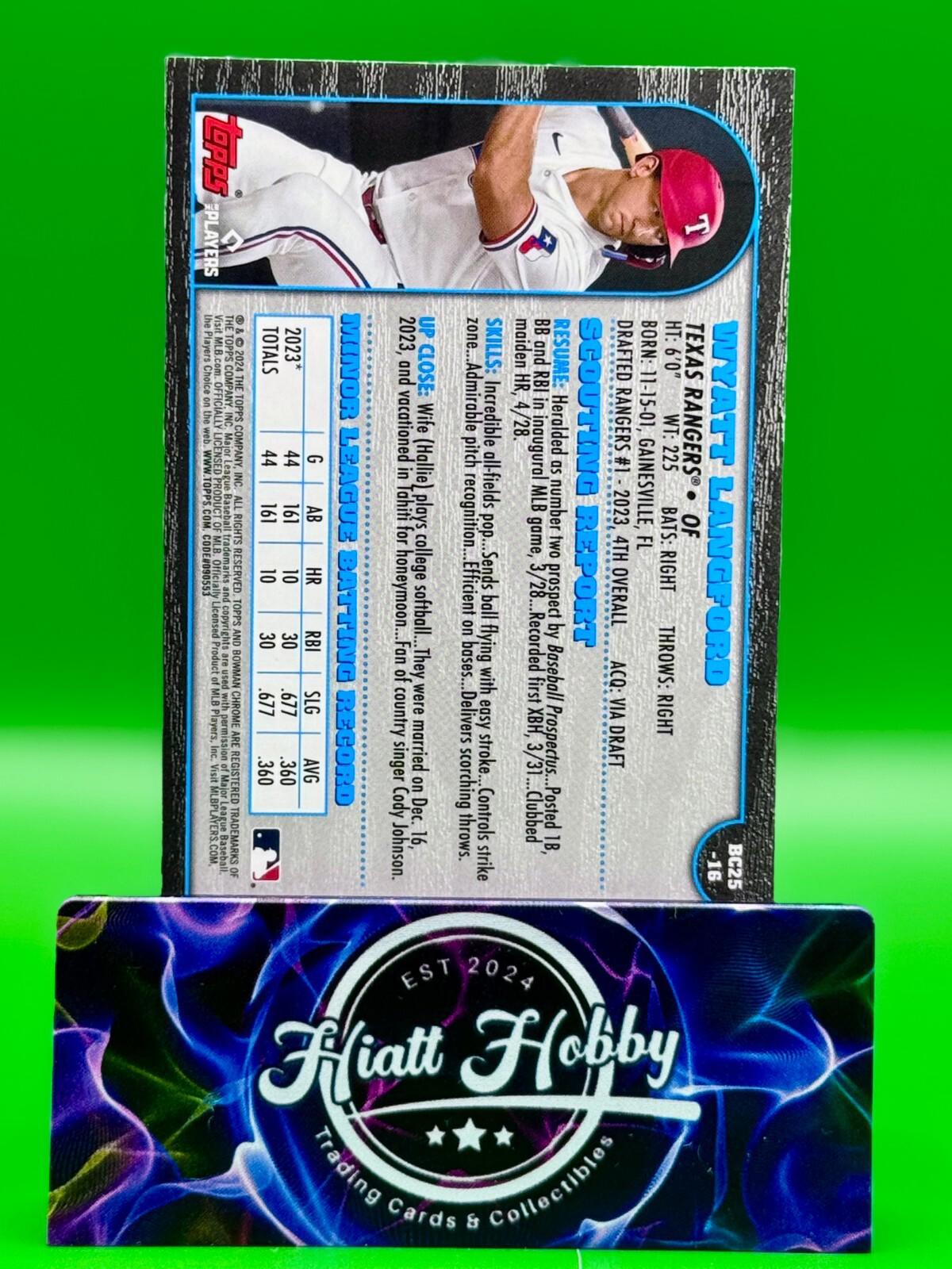 Celebrate a milestone in baseball history with the 2024 Bowman Chrome 25th Anniversary edition featuring rookie card #BC25-16 of Wyatt Langford. This card commemorates the Major League Baseball World Series and is a must-have for Texas Rangers fans and collectors alike. The card is a standard size, produced by Topps in the United States, and is presented in English.As part of the special 25th Anniversary insert set, this sports trading card captures the essence of the modern baseball era. It's an exceptional piece of memorabilia from the 2024 season, highlighting the craftsmanship of the manufacturer and the potential of the player. Add this unique item to your collection and own a piece of baseball legacy.