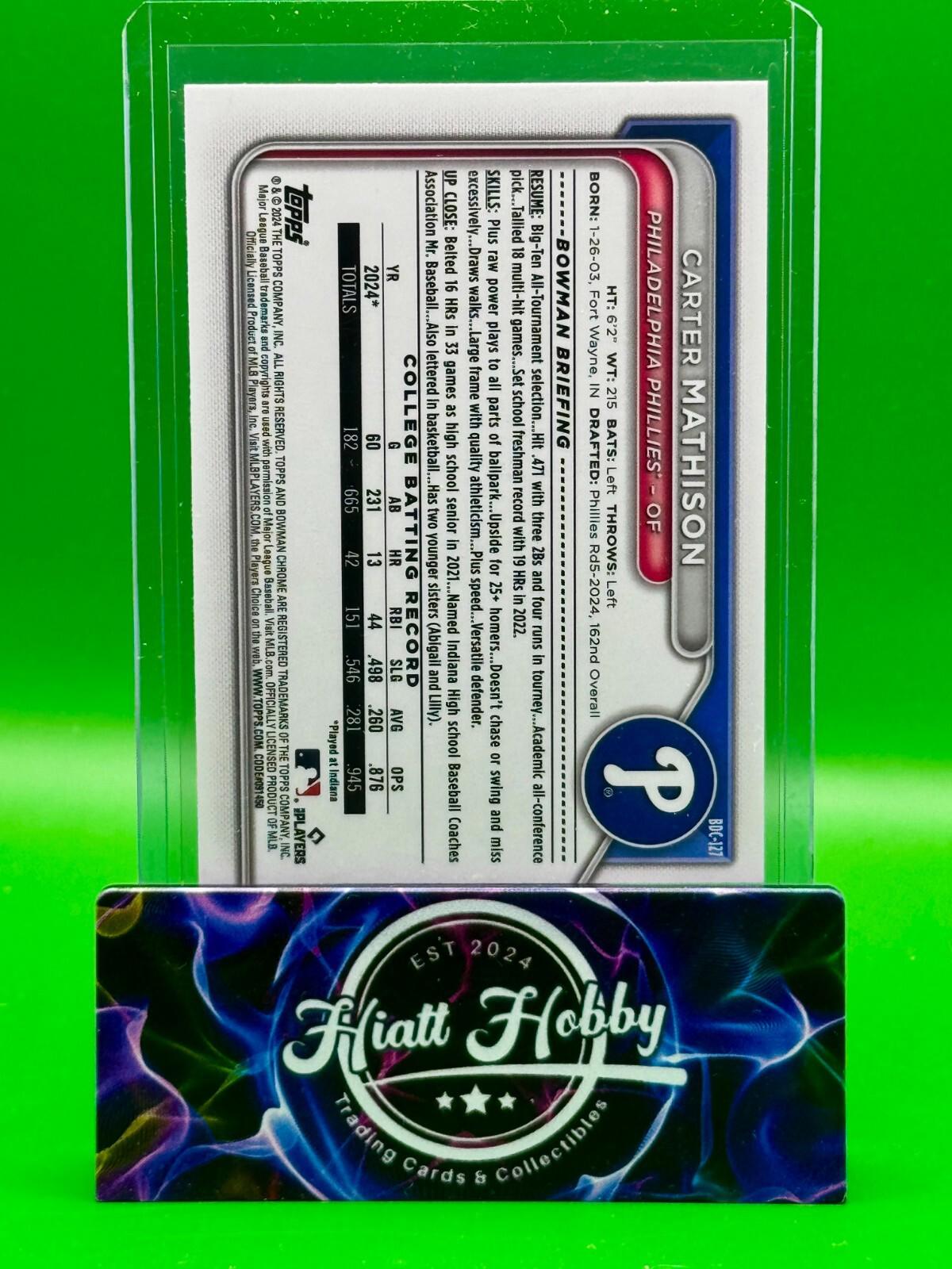 Capture the excitement of the diamond with this 2024 Bowman Draft Chrome Baseball card featuring Carter Mathison of the Philadelphia Phillies. This Blue Refractor card is a must-have for collectors and fans alike, highlighting Mathison's potential as a standout player. The card is serial numbered, indicating its exclusivity with only 150 in existence.Crafted by Topps, a trusted name in sports memorabilia, this card is part of the 2024 Bowman Draft Chrome set and is manufactured in the United States. It's a non-autographed, original piece that celebrates the thrill of the MLB World Series event. This rookie card, numbered BDC-127, is a great addition to any baseball card collection or a thoughtful gift for the sports enthusiast in your life.