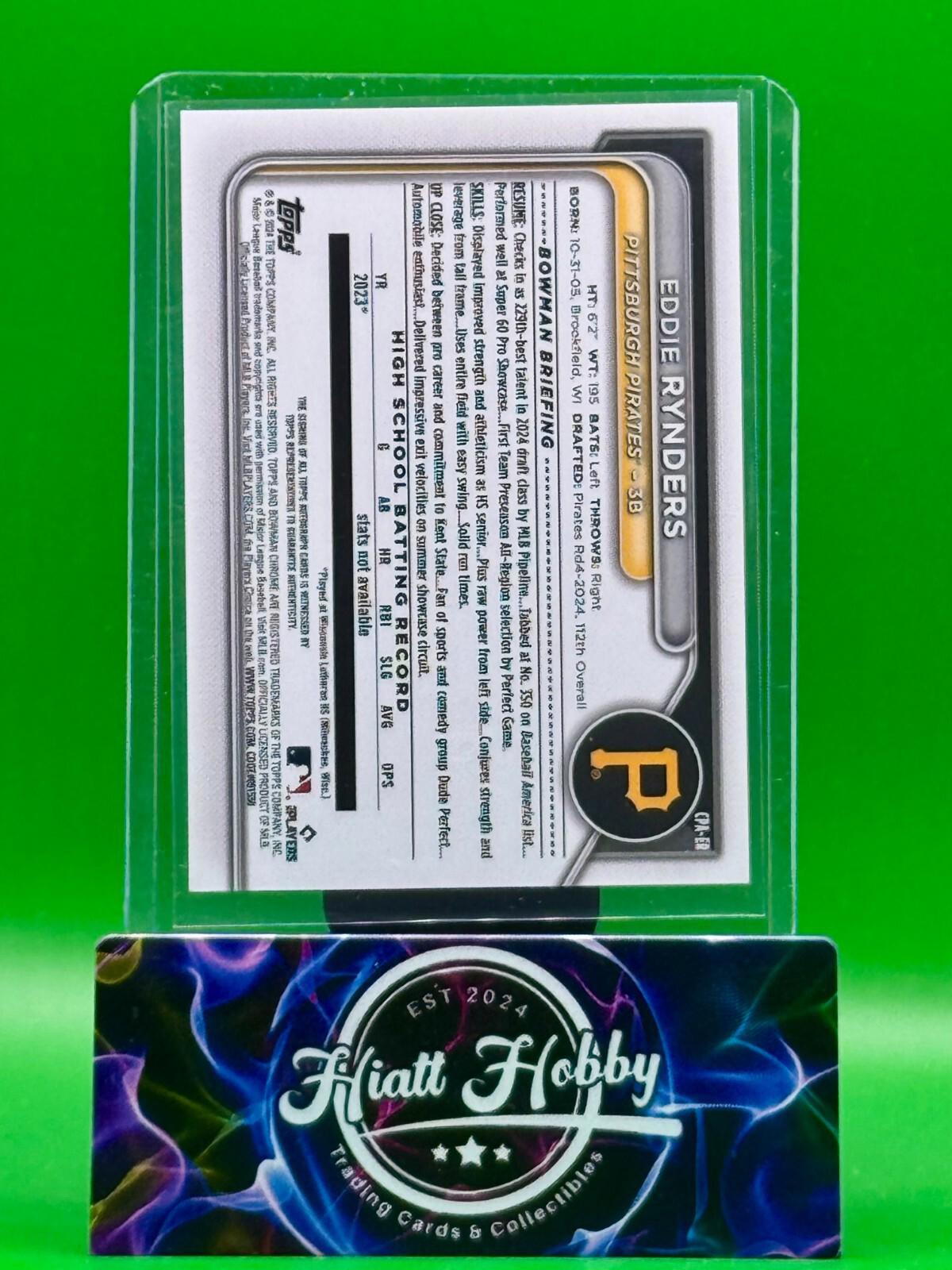 Capture the excitement of the diamond with the 2024 Bowman Draft Chrome Prospect Autographs card featuring Eddie Rynders, card number CPA-ER. This sought-after rookie card is a treasured addition for collectors and fans of the Pittsburgh Pirates, showcasing one of the team's promising talents. Authenticated by Topps, the card is adorned with a hard-signed autograph from Rynders himself, ensuring its authenticity and adding unparalleled value.As part of the esteemed 2024 Bowman Draft set, this card is a reflection of the player's potential and the sport's rich heritage. Presented in a sleek chrome finish, it's a contemporary collectible that celebrates the MLB World Series event. This standard-sized, English-language card is a must-have for enthusiasts looking to commemorate Baseball's upcoming season.