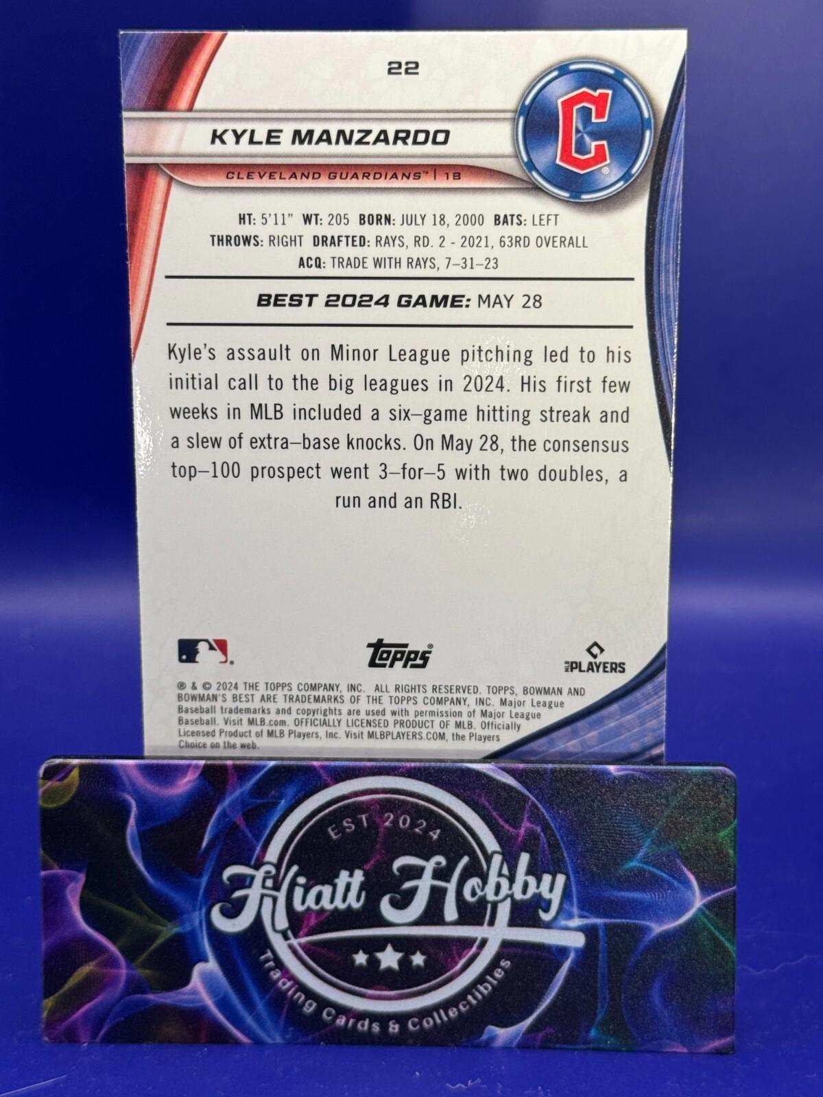 Capture the excitement of the diamond with the 2024 Bowman's Best Baseball card featuring Kyle Manzardo, card number 22, in its stunning Mini Diamond Refractor parallel. A treasure for collectors and fans alike, this card showcases the promising talent of Manzardo with the Cleveland Guardians, rendered in exquisite detail that does justice to the art of baseball card design.Limited to a print run of just 299, this serial numbered rookie card is a must-have. It's a genuine piece of sports memorabilia from Topps, the authority in sports trading cards, ensuring its authenticity and quality. Add this piece to your collection and celebrate the 2024 MLB season with a piece of history in your hands.