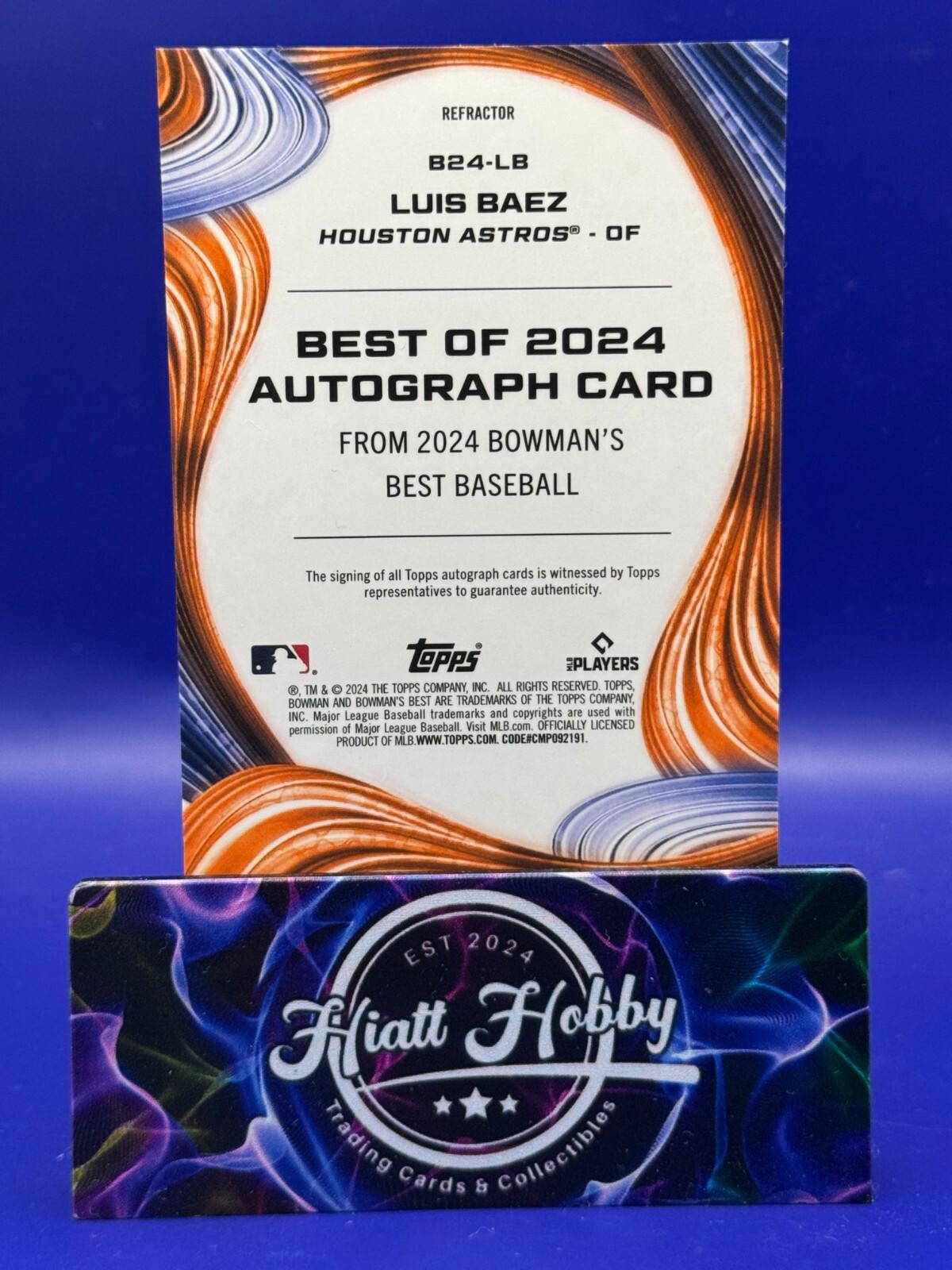 Capture a piece of baseball history with the 2024 Bowman's Best Baseball Luis Baez autographed card, #B24-LB. This sought-after rookie insert features Luis Baez of the Houston Astros, commemorating his standout season with a hard-signed signature authenticated by Topps. A must-have for collectors, the card celebrates the MLB World Series event in a stunning refractor finish that shines among your sports memorabilia.Enhance your collection with this original English-language sports trading card, manufactured by Bowman and part of the exclusive Best of 2024 Autograph Card insert set. This card, crafted in the United States, boasts a standard size and is a cherished piece for any fan of baseball or the athlete himself. Add a touch of the diamond to your collection with this standout card.