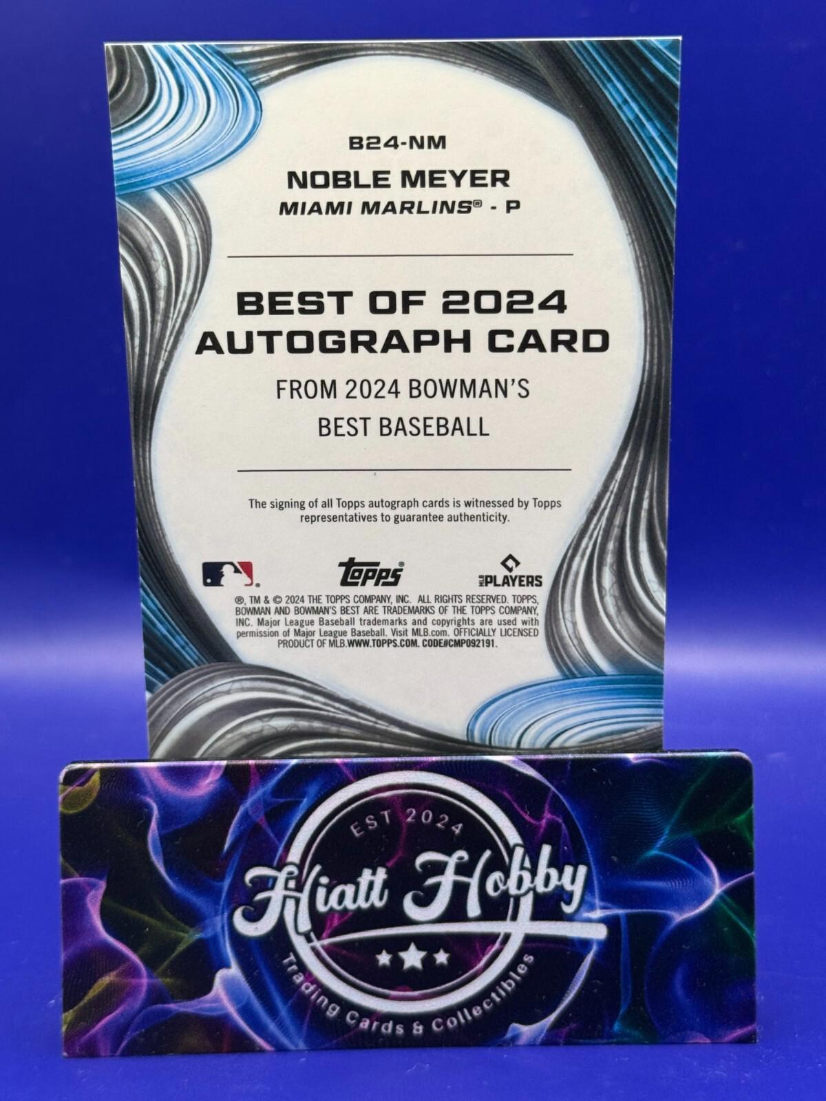 Elevate your baseball card collection with the 2024 Bowman's Best Baseball Noble Meyer Gold Auto card, a limited edition piece numbered to just 50. This card celebrates Miami Marlins' promising talent, Noble Meyer, and features his authentic signature authenticated by Topps. As a part of the exclusive Best of 2024 Autograph Card insert set, it's a must-have for enthusiasts and collectors alike.Crafted by Topps, this card is from the prestigious 2024 series and boasts a stunning gold parallel variety, adding a touch of elegance and rarity. With its serial numbering and rookie status, it holds potential for increased value and significance. It's a standard-sized piece of baseball memorabilia that captures the spirit of the MLB World Series event in a tangible form.