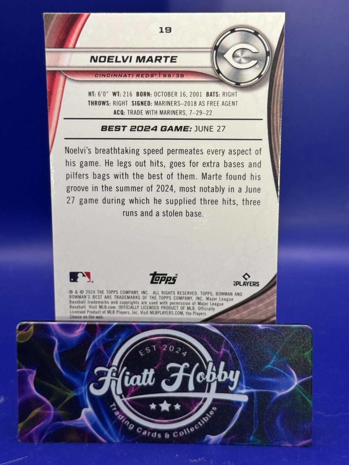 Capture the excitement of the diamond with this 2024 Bowman's Best Baseball card featuring rising star Noelvi Marte of the Cincinnati Reds. This Wave Refractor card is a must-have for collectors and fans alike, showcasing the talent and potential of this young athlete. The card is produced by renowned manufacturer Topps and is part of the highly sought-after 2024 Bowman's Best set.This original card is made of high-quality card stock and features standard dimensions. It is not autographed and is printed in English. The card is a celebration of the MLB World Series event and is crafted in the United States. Add this card to your collection to commemorate the 2024 season and show your support for the Cincinnati Reds.