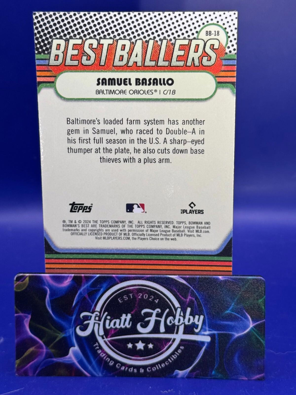 Elevate your baseball card collection with the 2024 Bowman's Best Baseball card featuring Samuel Basallo, card number BB-18, from the Best Ballers insert set. As a cherished piece from the reputable Topps manufacturer, this card showcases the promise of the Baltimore Orioles' rising star. The card is crafted from premium card stock and presents itself in a stunning refractor parallel/variety, adding a shimmering finish to its already impressive design.The card is a celebration of the MLB World Series event and is a must-have for fans and collectors alike. It is an English-language card, produced in the United States, and is an original piece, not a reprint. Among its features, you'll find that it is a rookie card, an insert, and a parallel/variety all in one, making it a valuable and unique addition to any collection.