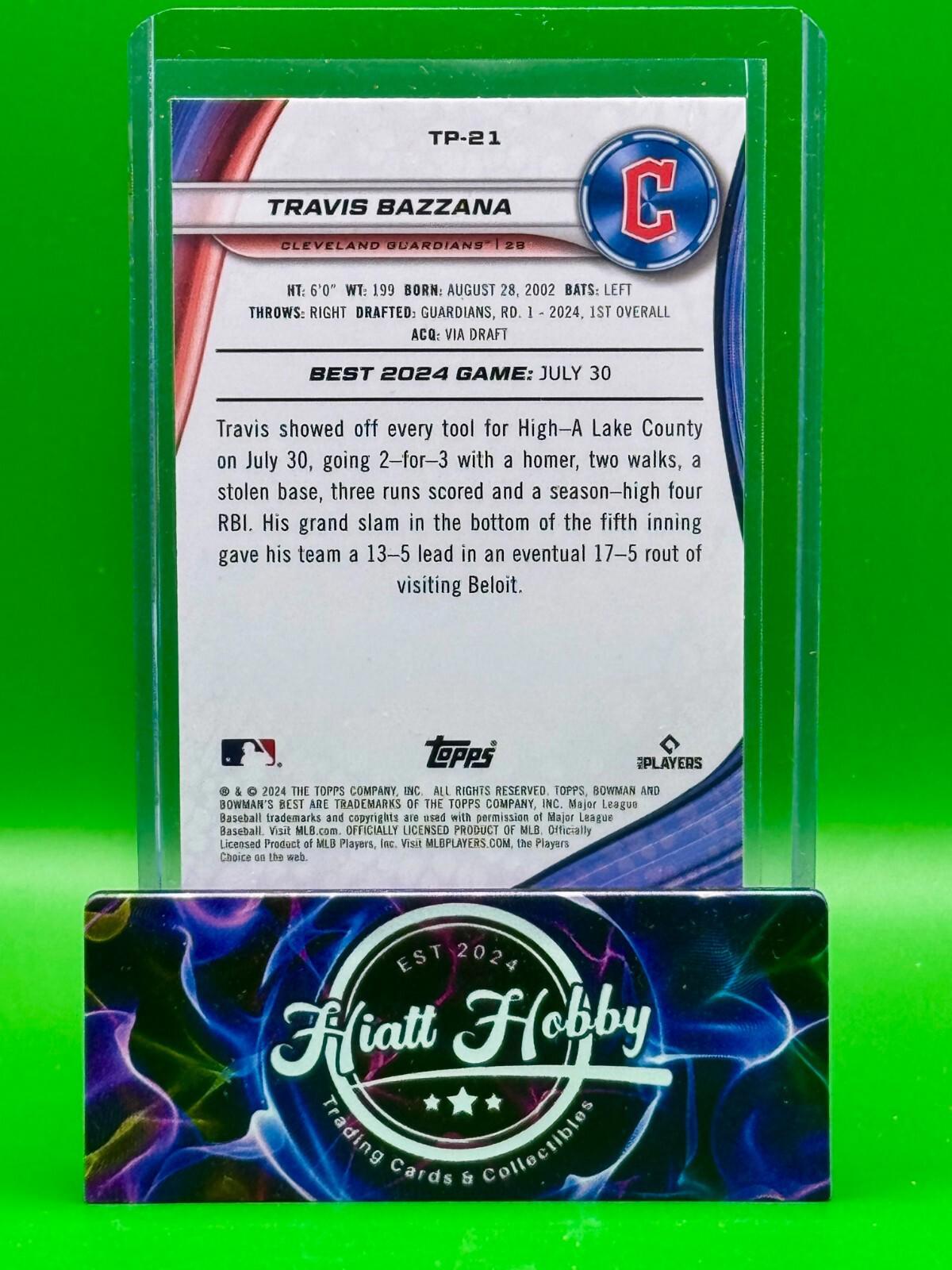 Capture the excitement of the diamond with this 2024 Bowman's Best Baseball card featuring Travis Bazzana of the Cleveland Guardians. This Aqua Lava Refractor card, numbered TP-21, is a must-have for collectors and fans alike, highlighting Bazzana's potential as a rookie in the MLB. With a limited print run of only 199, this card is a unique addition to any collection.Crafted from high-quality card stock and produced by Topps, a trusted name in sports memorabilia, this card celebrates the 2024 MLB World Series season. Although not autographed, the card's rarity and the inclusion of serial numbering offer a special touch of exclusivity. Add a piece of baseball history to your collection with this stunning aqua lava refractor card.