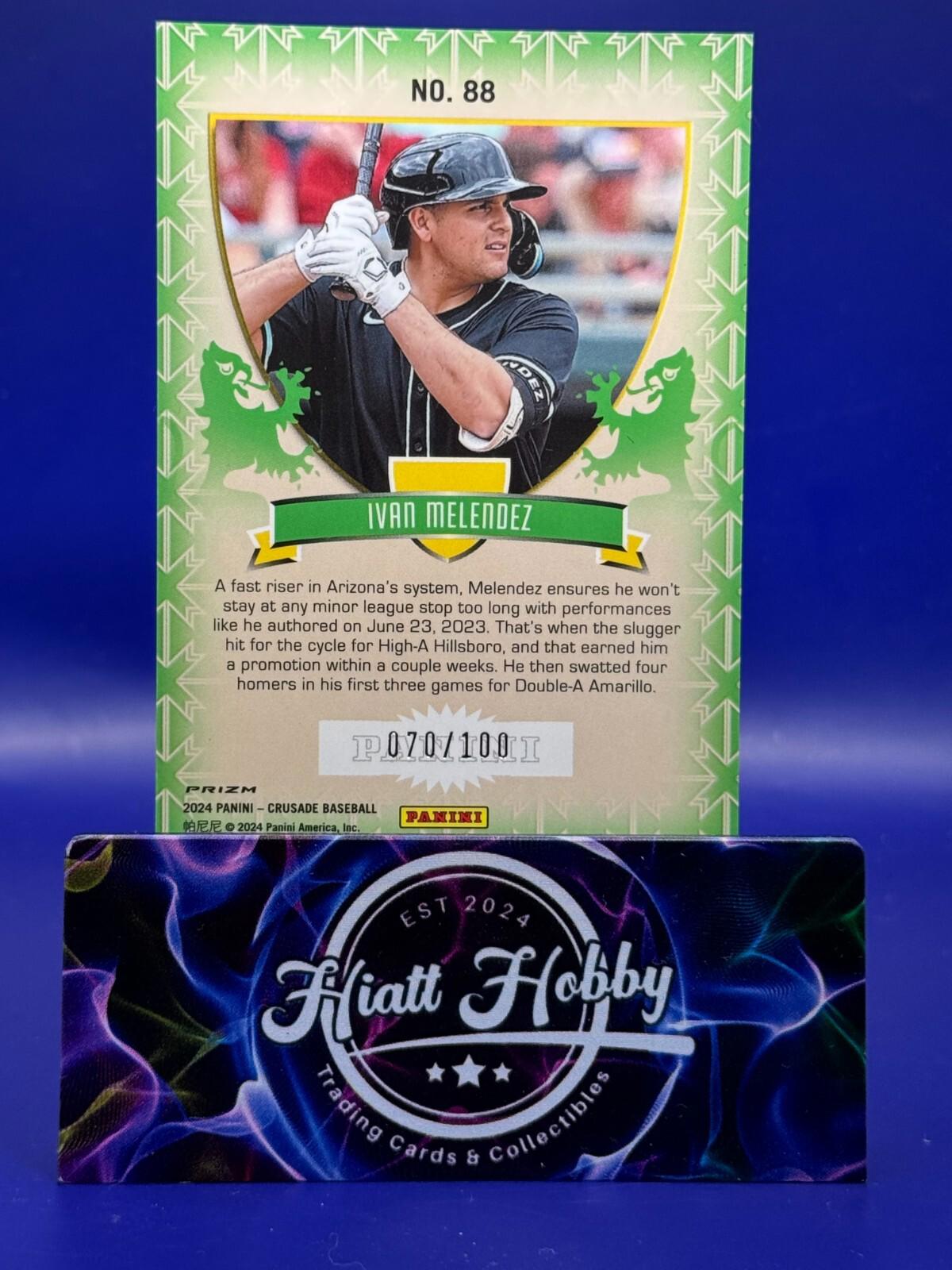 Capture a piece of baseball history with the 2024 Panini Crusade Crusade Purple #88 Ivan Melendez rookie card. Limited to a print run of just 100, this rare collectible is a must-have for fans and collectors alike. Featuring the promising talent of Ivan Melendez, this card is a valued addition to any Arizona Diamondbacks or MLB collection.Crafted with care in the United States, the card boasts a stunning purple parallel variety, adding an exclusive touch to your assortment. The card is standard-sized, presented in English, and does not include an autograph. It represents Melendez's entry into the big leagues, making it a special keepsake for those who follow the MLB World Series.