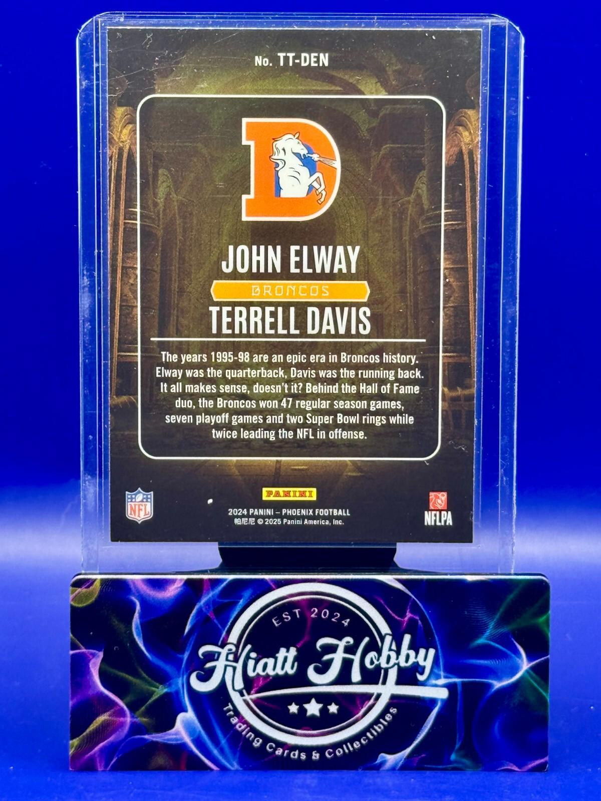 The 2024 Panini Phoenix Elway/Davis #TT-DEN card from the Treasured Tandems insert set features a standard-sized football trading card made of card stock. This original card showcases legendary players Terrell Davis and John Elway from the Denver Broncos in the National Football League (NFL). Manufactured in 2025 by Panini in the United States, the card commemorates a beloved tandem and is a valuable collectible for fans of football and trading cards.