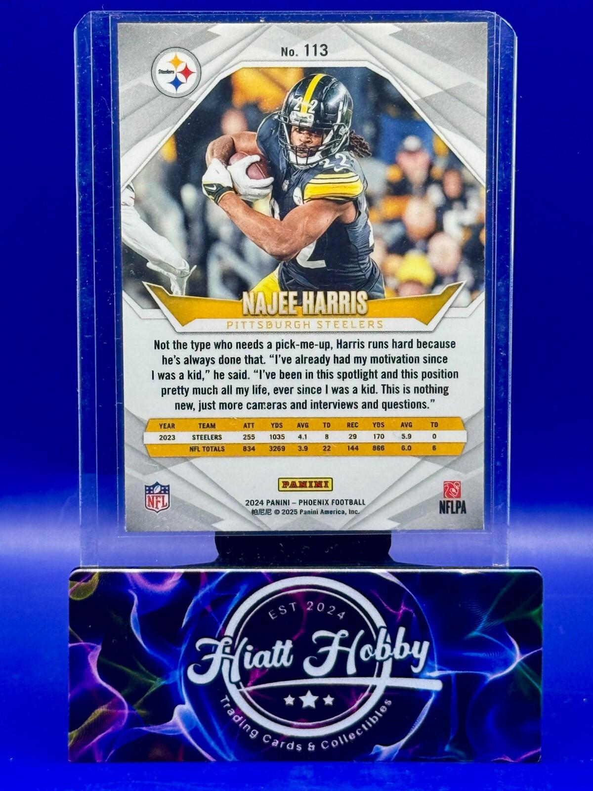 The 2024 Panini Phoenix Najee Harris #113 Hyper Prizm trading card is a standard-sized card featuring the Pittsburgh Steelers running back from the National Football League (NFL). Manufactured by Panini, this original card is made of card stock and is part of the 2024 Panini Phoenix Football set. The card is not autographed and is in English language. This rare Hyper Prizm parallel variety card is a must-have for fans of football and sports trading cards.