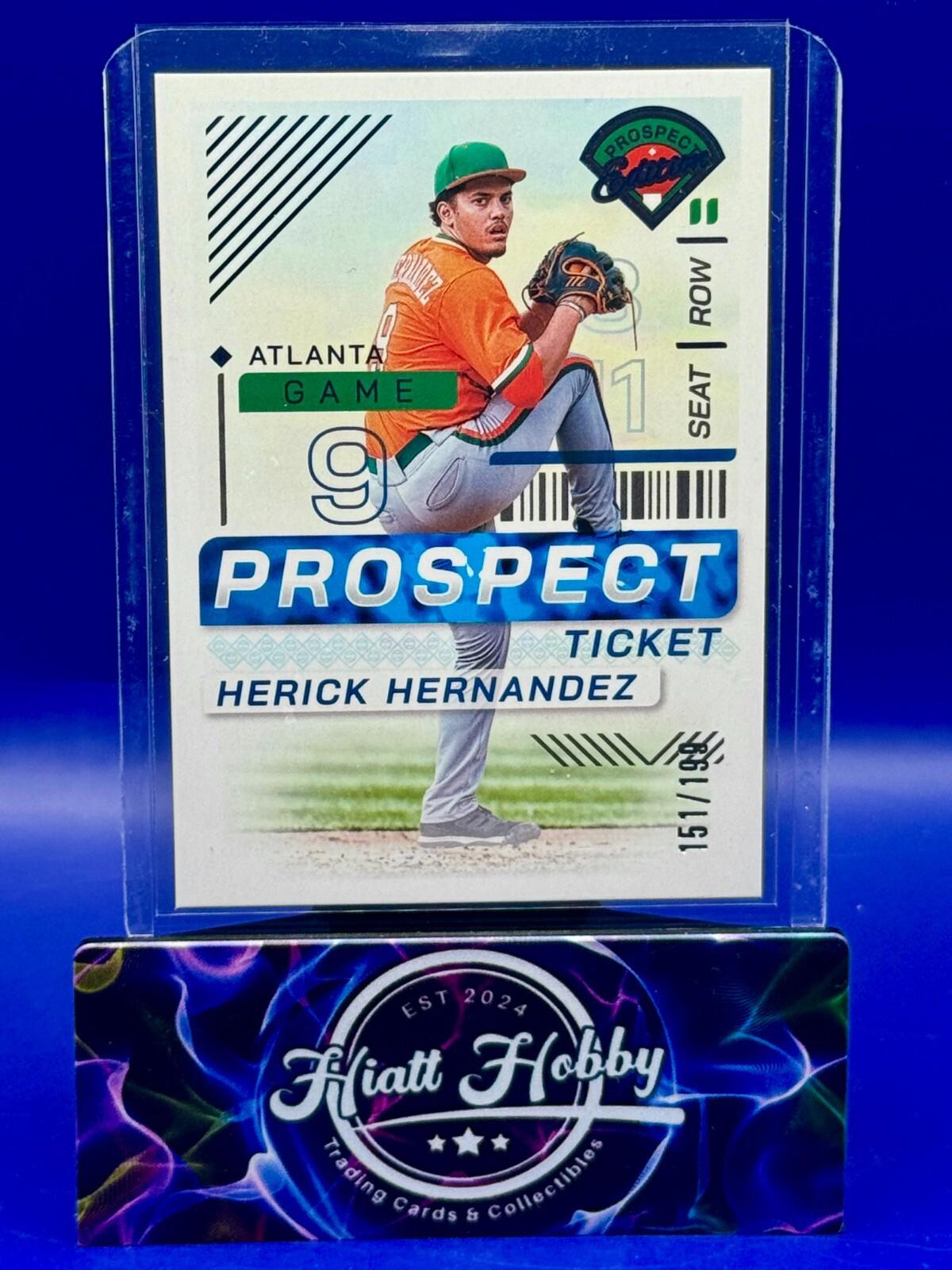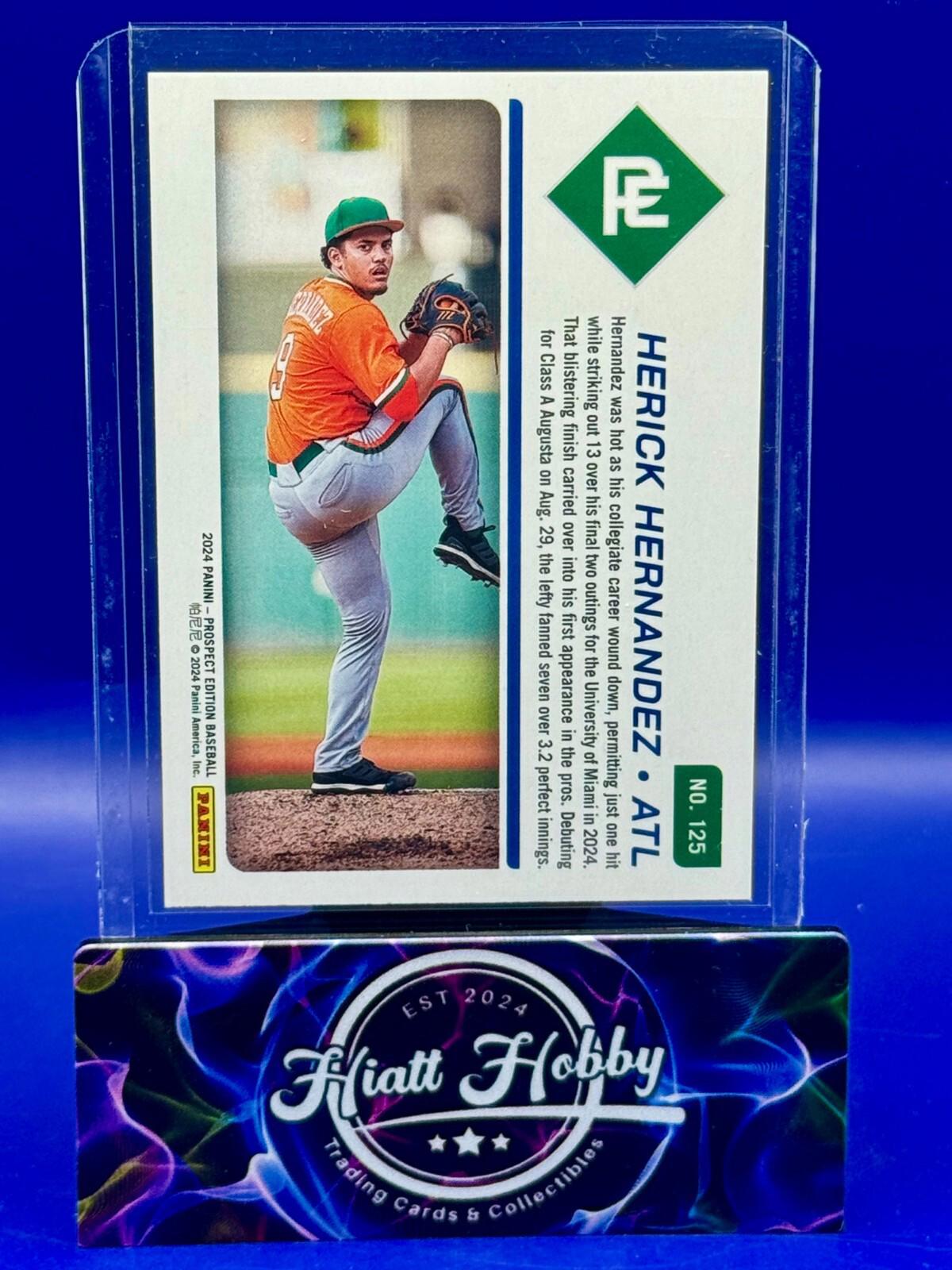 The 2024 Panini Prospect Edition - Herick Hernandez #125 - Blue /199 (RC) is a standard-sized sports trading card featuring the Major League Baseball player Herick Hernandez from the Atlanta Braves. This original card is made of card stock with a print run of 199, and is part of the 2024 Panini Prospect Edition Baseball set. It is blue in parallel/variety and is serial numbered, making it a desirable rookie card for collectors. The card is manufactured by Panini in the United States and is a valuable addition to any baseball card collection.
