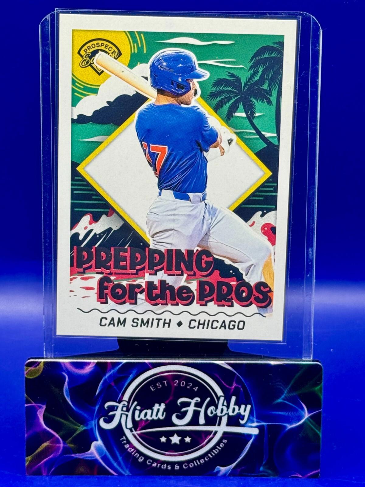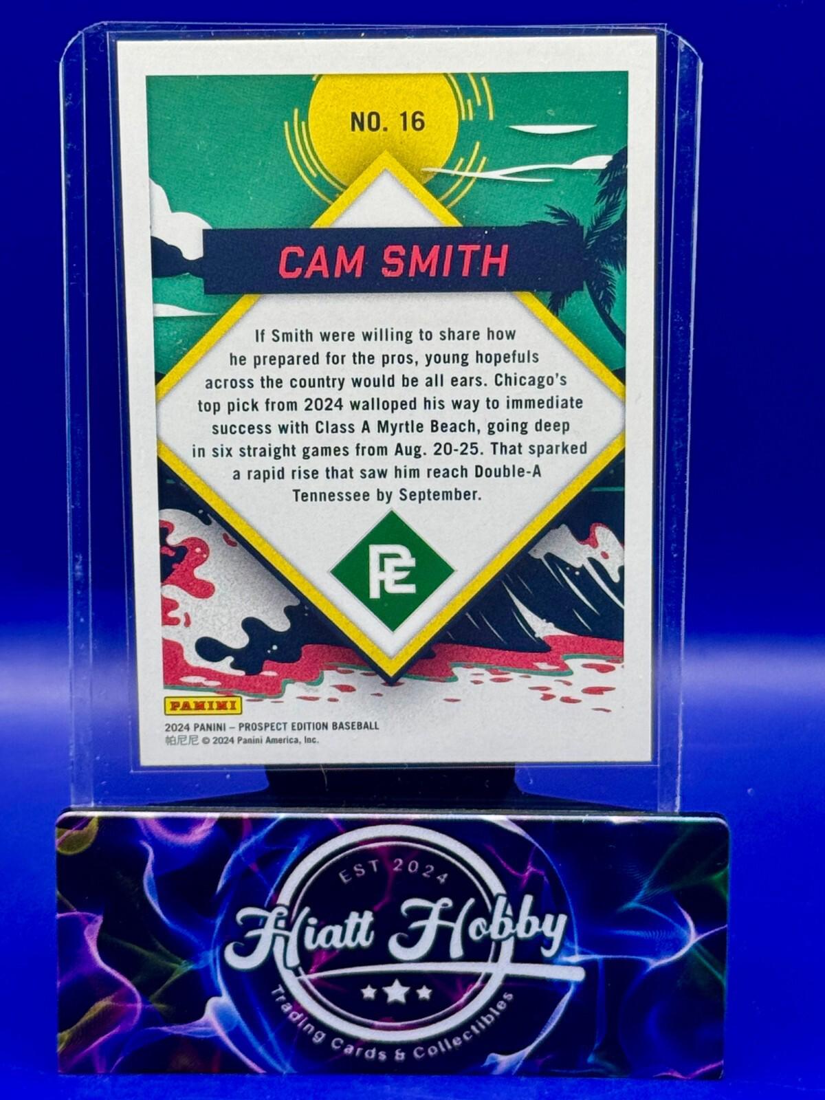 The 2024 Panini Prospect Edition Prepping for the Pros Cam Smith #16 (RC) trading card is a baseball collectible featuring rookie player Cam Smith from either the Chicago Cubs or Houston Astros. This original card, part of the MLB World Series set manufactured by Panini, is in English and features standard card size. It is a part of the 2024 Panini Prospect Edition Baseball collection, making it a sought-after item for fans and collectors alike.