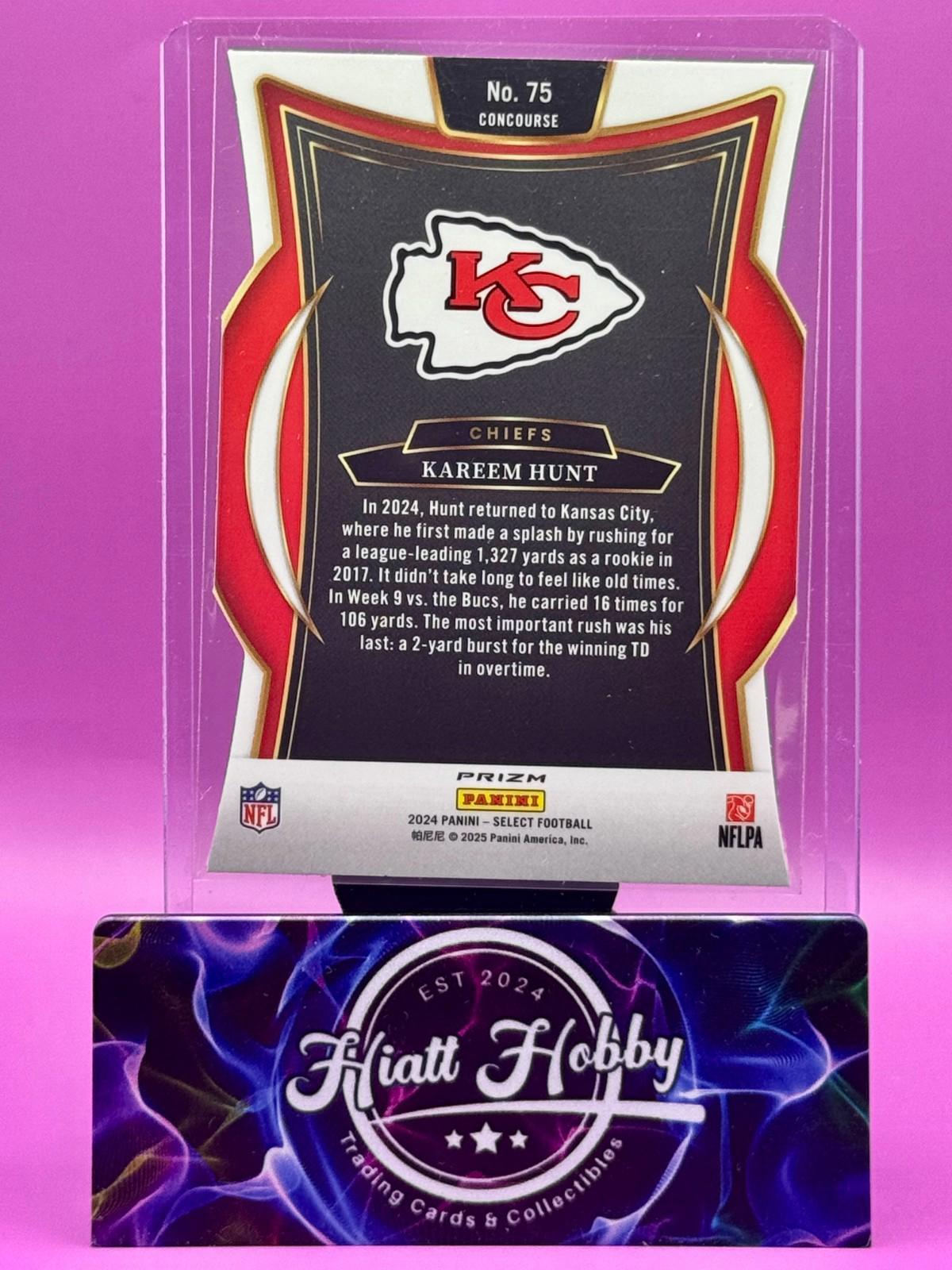 The 2024 Panini Select Concourse Kareem Hunt #75 Silver Prizm Die-Cut trading card is a sought-after collectible for fans of the National Football League. Manufactured by Panini, this original card features the star running back from the Kansas City Chiefs in a unique die-cut silver prizm parallel variety. With the card stock material and English language, this sports trading card is a valuable addition to any football card collection for enthusiasts and collectors alike.