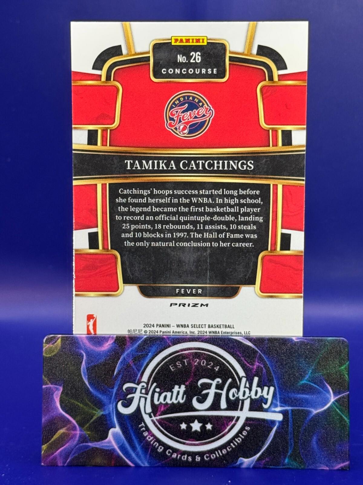 Elevate your collection with the 2024 Panini Select WNBA Basketball card featuring the legendary Tamika Catchings of the Indiana Fever. This Concourse #26 card showcases the Tiger Prizm parallel, bringing an extra layer of exclusivity and visual appeal to this piece of basketball memorabilia. As part of the esteemed 2024 Panini Select WNBA series, it captures the essence of the sport and the prowess of a true basketball icon.This card is a testament to Catchings' impressive career and her contributions to the Women's National Basketball Association. Crafted in the United States and presented in standard card size with English language details, it's a must-have for fans and collectors alike. Celebrate the legacy of Tamika Catchings and the intensity of the WNBA Finals with this stunning collectible card.