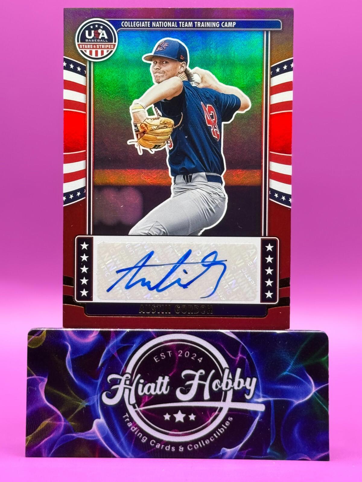 Capture a piece of baseball history with the 2024 Panini Stars and Stripes Collegiate National Team Signatures Red card featuring Austin Gordon. As a limited edition collectible, this card bears the autograph of the promising athlete, authenticated by Panini Authentic, ensuring its legitimacy and value. With a limited print run of just 49, this rookie card is a must-have for fans and collectors alike.Embellished with a bold red parallel variety, the card showcases Gordon in his USA Baseball Collegiate National Team uniform, capturing the essence of his debut season. The standard card size ensures it fits seamlessly into any collection, while the English language card is perfect for an American audience. Celebrate the Major League Baseball legacy with this exquisite piece of memorabilia.