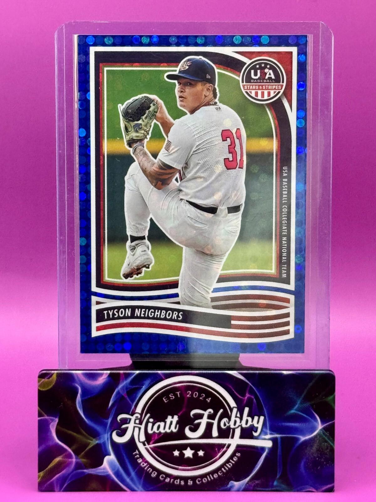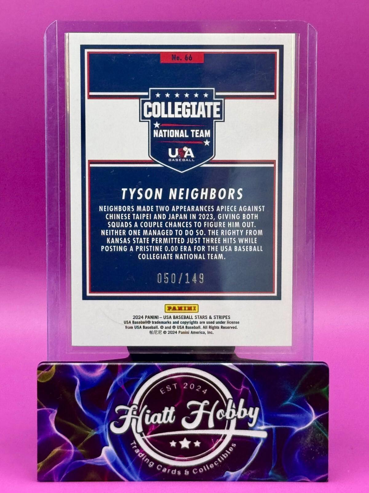 The product is a 2024 Panini Stars and Stripes trading card featuring Tyson Neighbors #66 in a Blue parallel limited to 149 copies. This rookie card is part of the MLB World Series set for baseball fans and collectors. Manufactured by Panini in the United States, this original card is serial numbered and targeted towards fans of the USA Baseball Collegiate National Team. With a focus on the Major League (MLB) and featuring a limited print run, this card is a valuable addition to any baseball card collection.