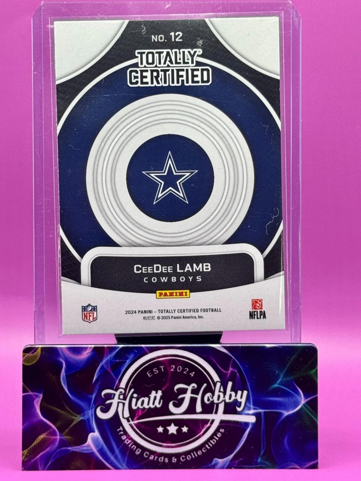 The 2024 Panini Total Certified Football card featuring CeeDee Lamb #12 is a highly sought-after collectible for fans of the Dallas Cowboys and football enthusiasts. This standard-sized card is made of card stock with a 20 Pt. thickness, perfect for showcasing intricate designs and details. The On Target insert set adds a unique element to the card, making it a standout piece in any collection. Manufactured by Panini, this original sports trading card is a valuable addition to any football card collection, especially for those following the career of CeeDee Lamb in the NFL.