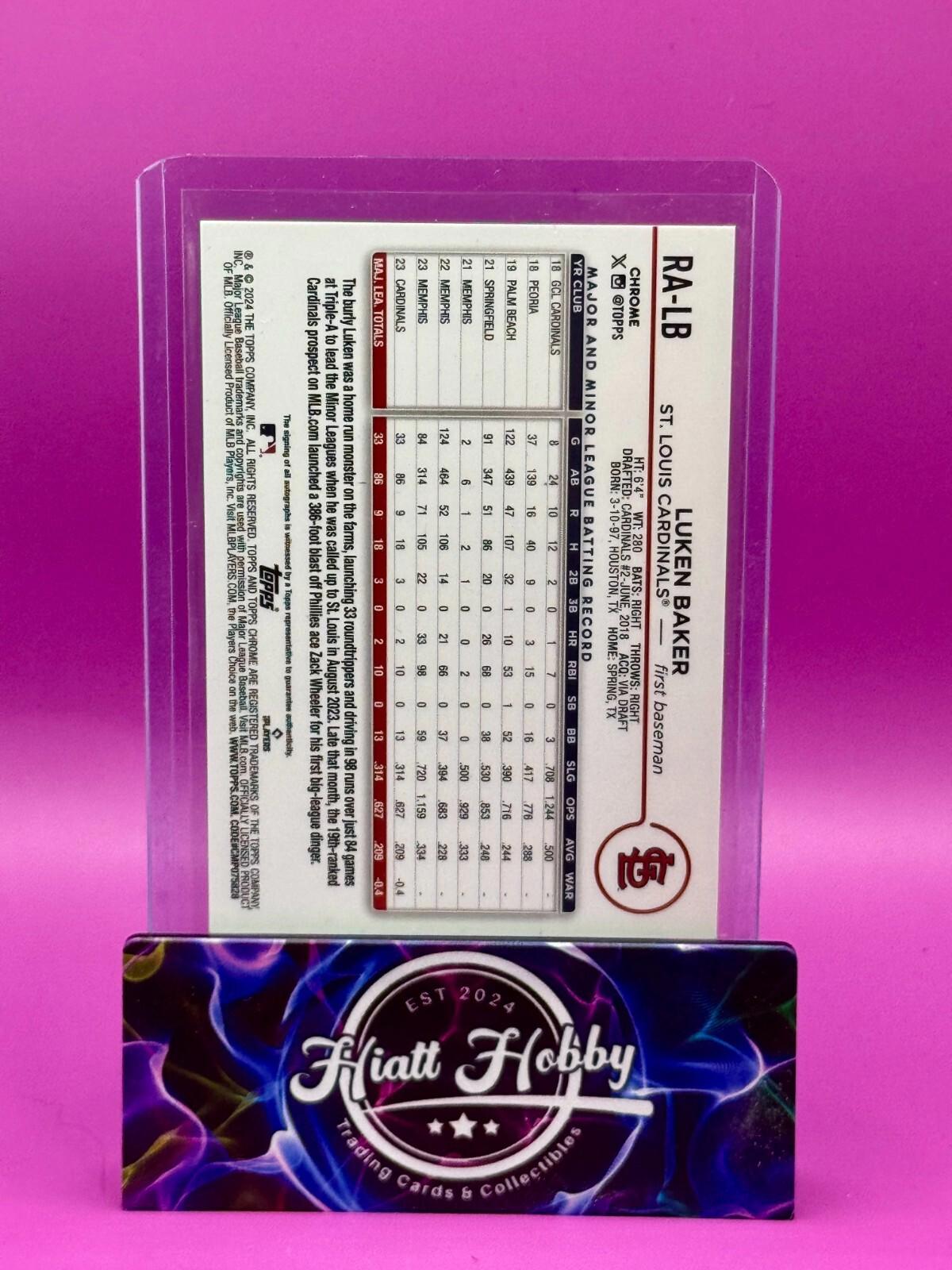The product is a 2024 Topps Chrome Baseball trading card featuring Luken Baker of the St. Louis Cardinals. This card is an autographed rookie card (#RA-LB) signed by Luken Baker himself. The card is part of the Rookie Autographs insert set and is an original licensed reprint by Topps. It is a standard-sized card manufactured in the United States for Major League Baseball fans and collectors. This unique item is a valuable and sought-after piece for baseball enthusiasts looking to add a special autographed card to their collection.