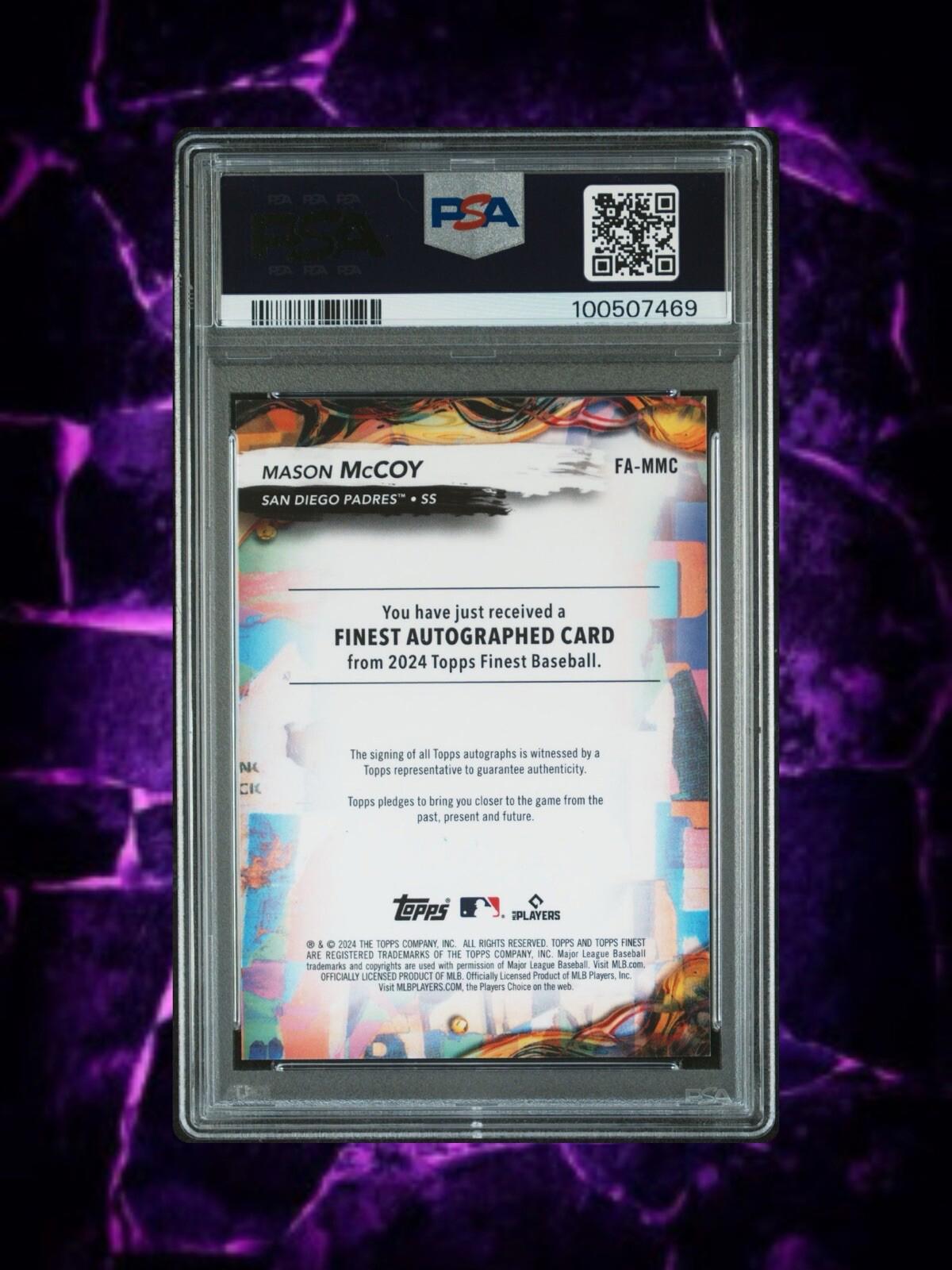This is a rare and collectible 2024 Topps Finest sports trading card featuring Mason McCoy of the San Diego Padres. The card is part of the Finest Autographs insert set and has a print run of 125. It is a parallel variety card with a purple refractor design and is serial numbered for added authenticity.
