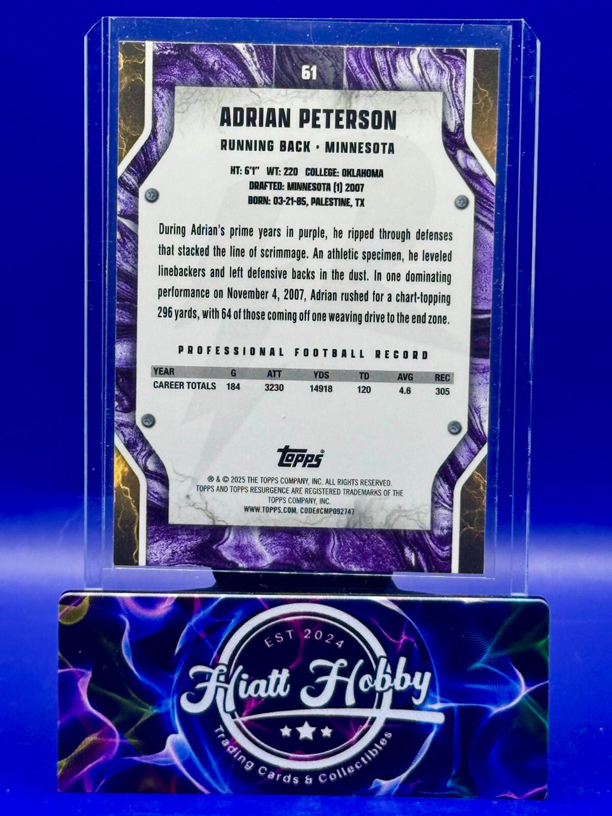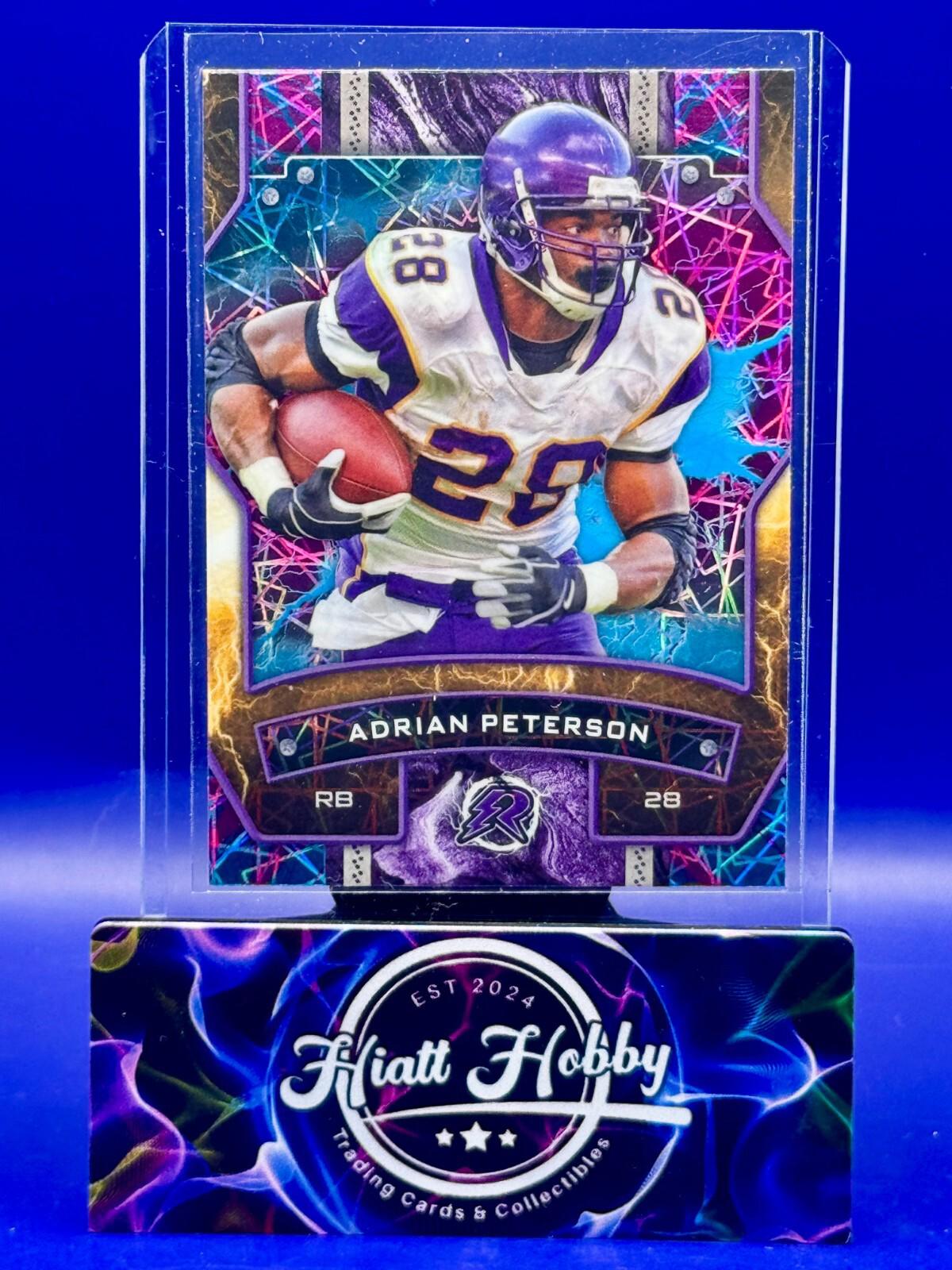 The product is a 2024 Topps Resurgence trading card featuring Adrian Peterson of the Minnesota Vikings, with a sky blue and pink shock parallel variety. This original card is made of card stock and is part of the National Football League (NFL) set. It does not include an autograph and was manufactured in 2025 by Topps in the United States. The card is in English and does not have a vintage design, making it a unique collectible for football fans and trading card enthusiasts.