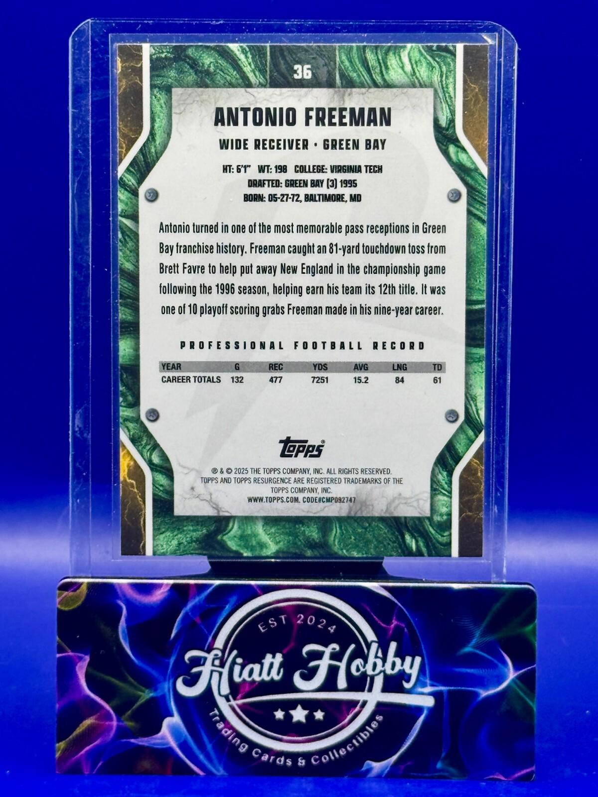 The 2024 Topps Resurgence Antonio Freeman #36 card is a sports trading card featuring the former Green Bay Packers player in a Sky Blue & Pink Shock parallel variety. Manufactured by Topps in the United States, this card is part of an original set for the 2024 season and is made of card stock. While not autographed, it captures a moment in football history related to a Super Bowl event, making it a valuable collectible for fans and collectors alike. This standard-sized card showcases a unique design and showcases the iconic player in the National Football League.