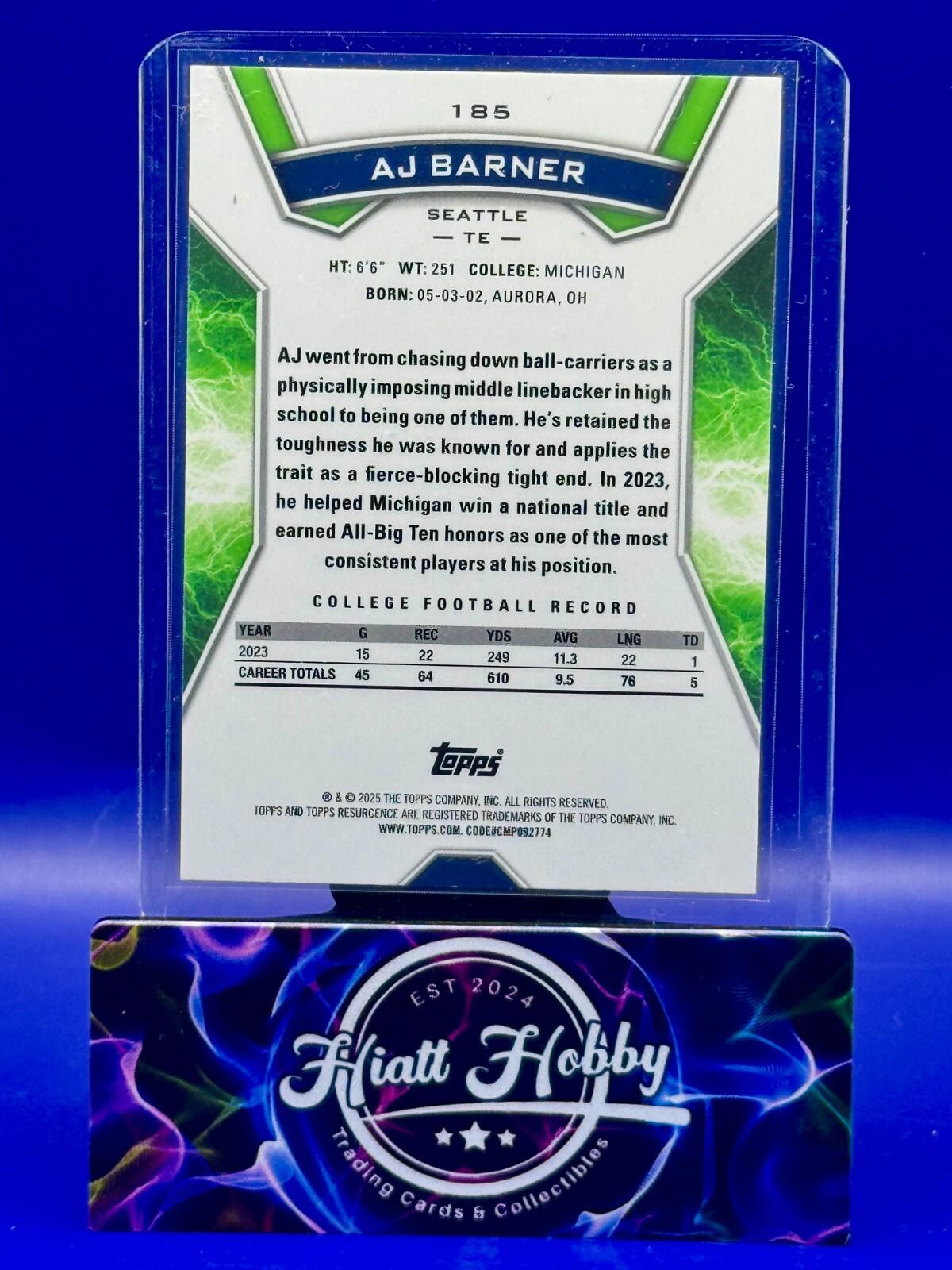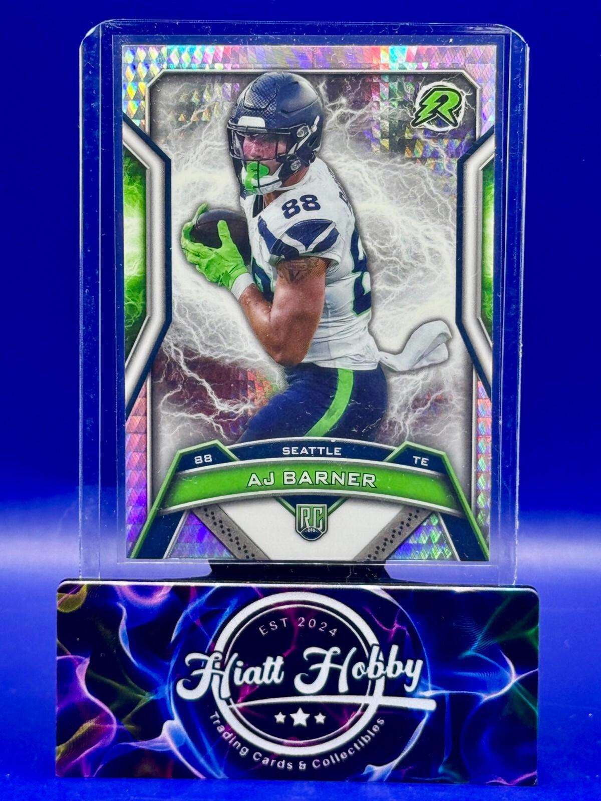 The 2024 Topps Resurgence - Rookies AJ Barner #185 - Prism Refractor (RC) is a standard-sized sports trading card featuring rookie player AJ Barner from the Seattle Seahawks. Manufactured by Topps in the United States, this original card is part of the 2024 Topps Resurgence set and showcases a Prism Refractor parallel variety. This football trading card is a valuable collectible for fans of the National Football League (NFL) and those interested in rookie players like AJ Barner. It is a sought-after item for collectors looking to add to their collection of football memorabilia.