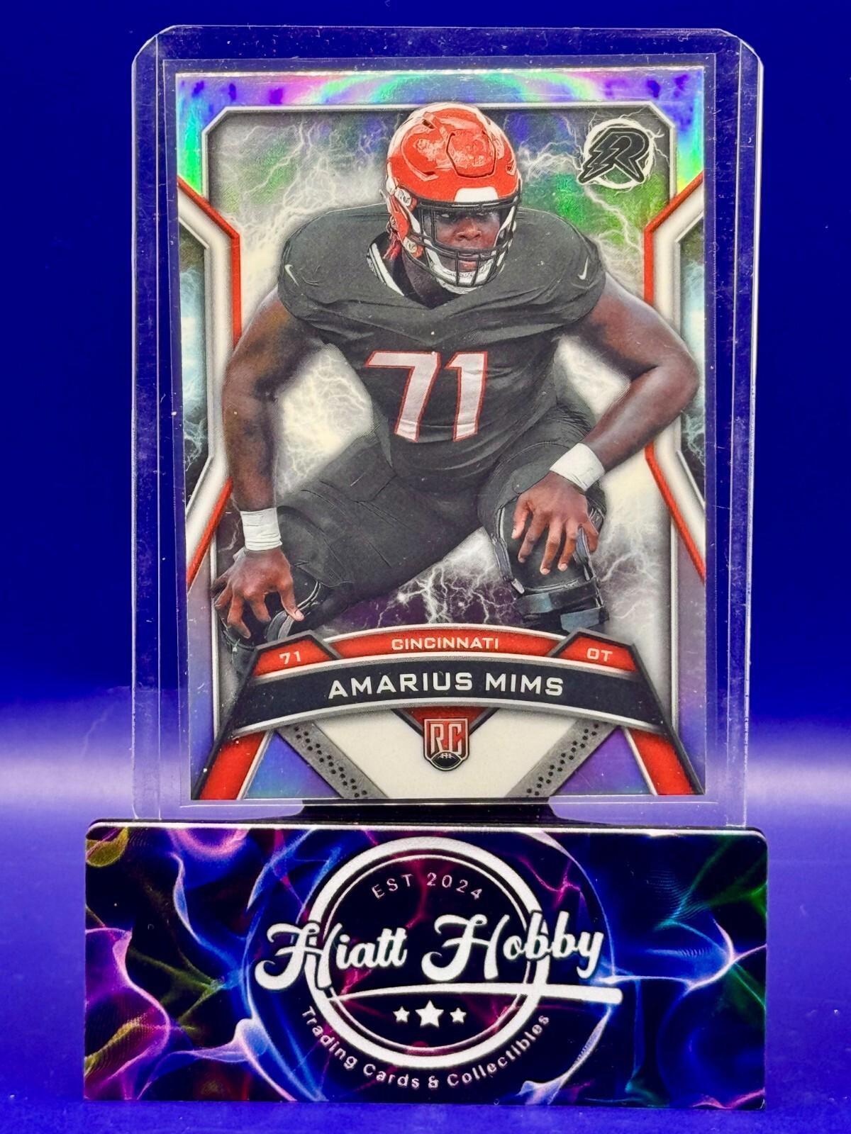 The 2024 Topps Resurgence Rookies Amarius Mims #121 Refractor trading card is an original sports collectible featuring the player Amarius Mims from the Cincinnati Bengals in the NFL. Manufactured by Topps, this card is made of card stock and belongs to the 2024 season. The refractor parallel adds a unique holographic effect to the card, making it a sought-after variety for football card collectors. Although not autographed, this card is part of a popular set and showcases a rising rookie player in the sport of football.