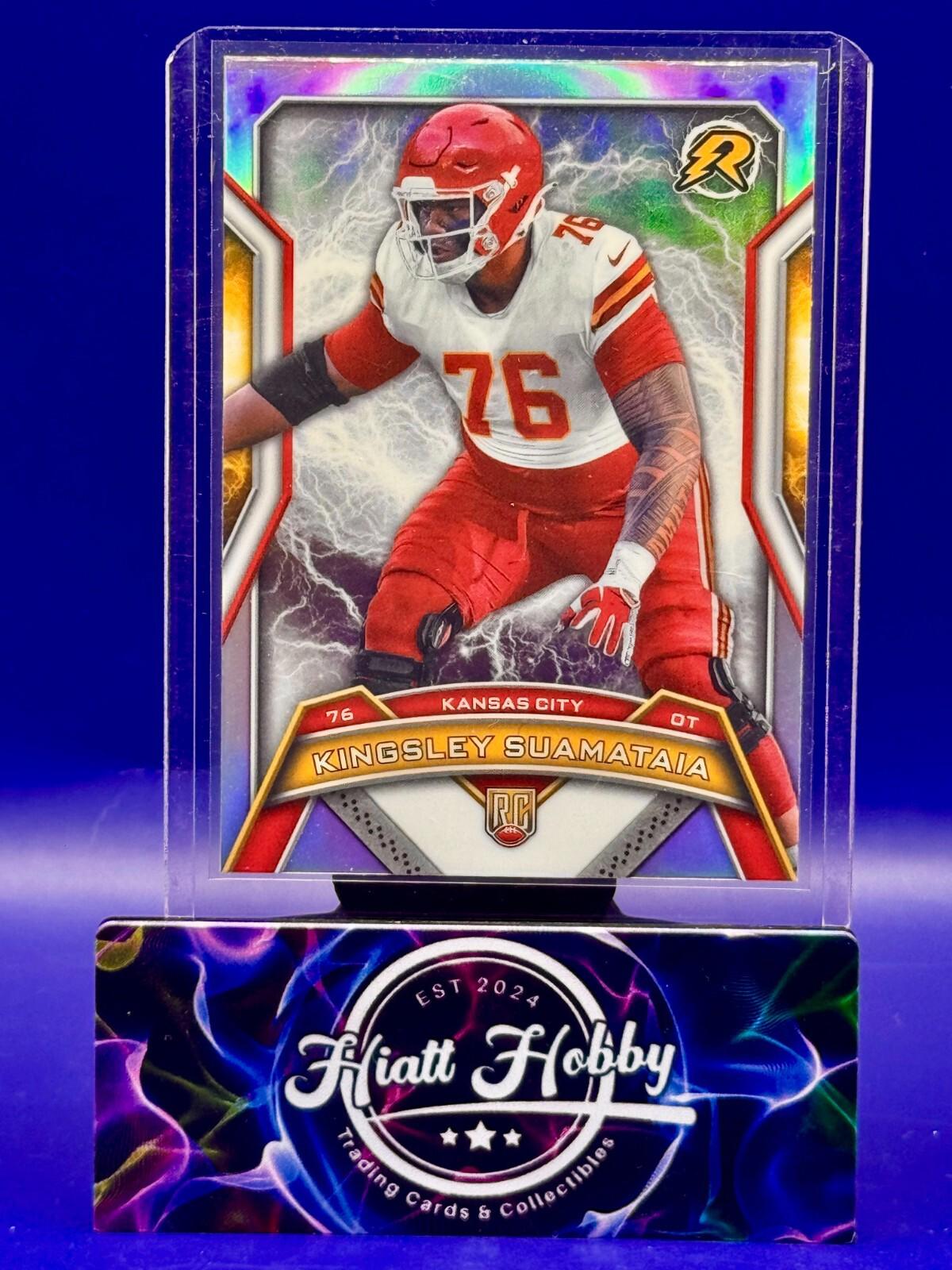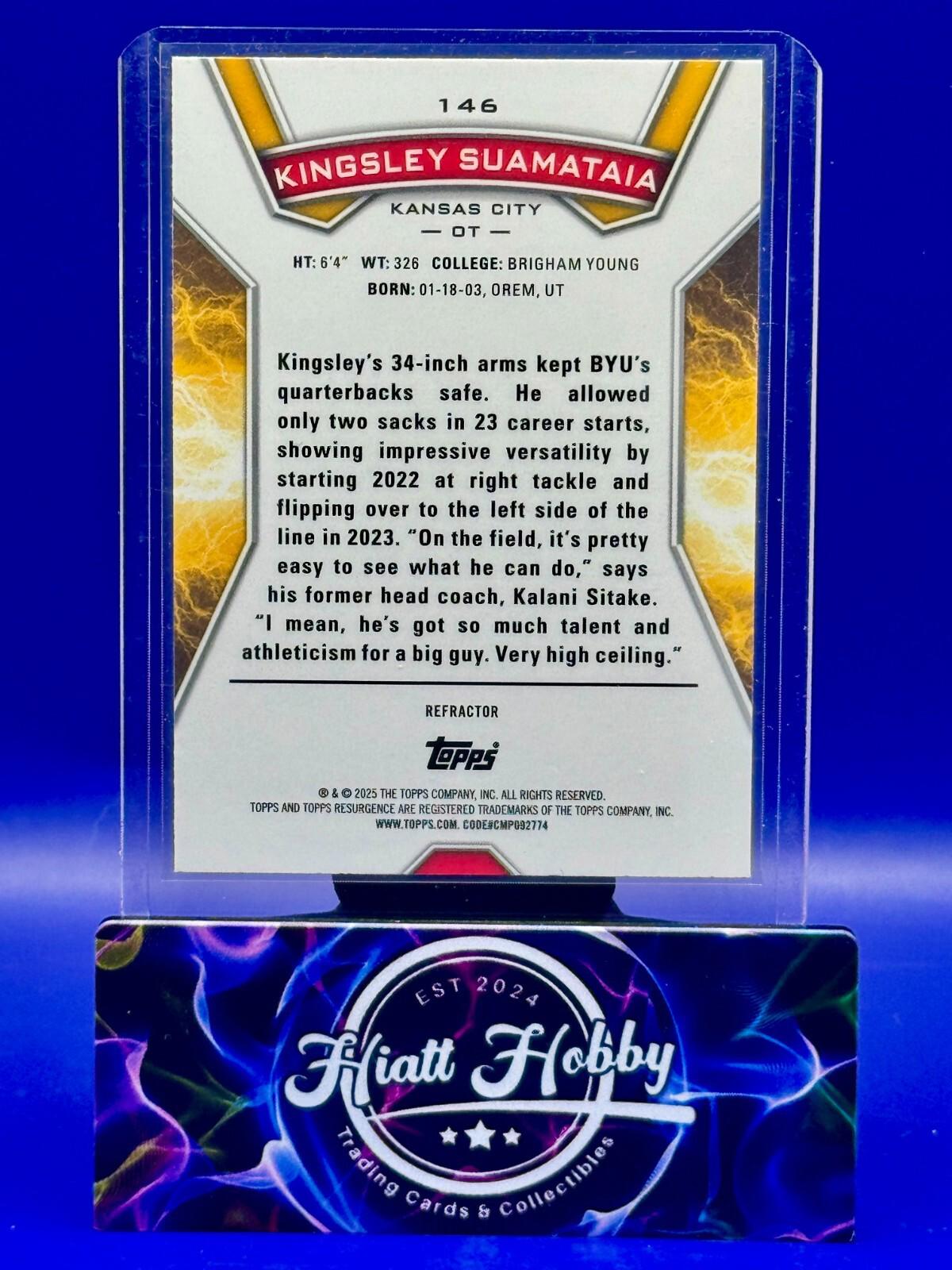 The 2024 Topps Resurgence - Rookies Kingsley Suamataia #146 - Refractor (RC) trading card is an original card manufactured by Topps, featuring the NFL rookie player Kingsley Suamataia from the Kansas City Chiefs. This card is part of the Resurgence Rookie Signatures insert set for the 2024 season, made of card stock material in English language. It is a standard-sized sports trading card with a refractor parallel/variety, making it a valuable collectible for football fans and card enthusiasts alike. Please Read: SHIPPING SCHEDULE We make every attempt to ship your item out quickly.  Our standard shipping schedule is Tuesday, Thursday, and Saturday drops at the post office and we include all items that have been paid for up to 5PM central the day prior.  That is, all purchases that have been paid for by 5PM central on a Monday will be included in the Tuesday shipment.  If the payment is received after the 5PM deadline, it will be part of the Thursday order drop. SHIPPING DETAILS Cards and Magazines are shipped out in padded or rigid envelopes and/or inserts to protect the item.  Individual cards are typically are shipped in a semi rigid card protector and a penny sleeve.  Combined orders will be packaged securely, but may not have a semi-rigid card protector (item will still be well protected) . Larger items are boxed up properly. We cannot control the USPS or UPS when it comes to the timely delivery of an item, their methods and handling of the item. Please DO NOT hold us responsible for the efforts of a delivery service, however, if you suspect damage to the package, please take pictures prior to opening and record the opening.  This would help with any insurance claims and reimbursements. We offer eBay Standard Envelope Shipping for orders at or below $20.  If your order exceeds $20, you must select USPS Ground Advantage for shipping in order for the order to be processed. SHIPPING INSURANCE Any Items that exceed $100 will include additional handling charges.  This fee is to cover the cost of insuring the item during transit. INTERNATIONAL SHIPPING We are pleased to now offer international shipping! PICTURES All photos are of the item you are bidding on when bidding on single item listings and will not be swapped out for other versions. Items that have multiple quantities will be in similar or better condition. PICTURES For listings that do not have variations, the card depicted in the photo is the card you will receive.  In cases that the listing has variations, the card may not be the same, but each card is inspected to ensure the same level of condition. MULTIPLE PURCHASES When purchasing multiple item from us, please wait to discuss before paying.  We will combine shipping for you and try to save some money. RATINGS & FEEDBACK If you have an issue with something, please try and contact us first so that we may try and work it out. If we come to a satisfactory conclusion, please consider providing a favorable review and positive feedback. Thank you so much for any business that you do with us.