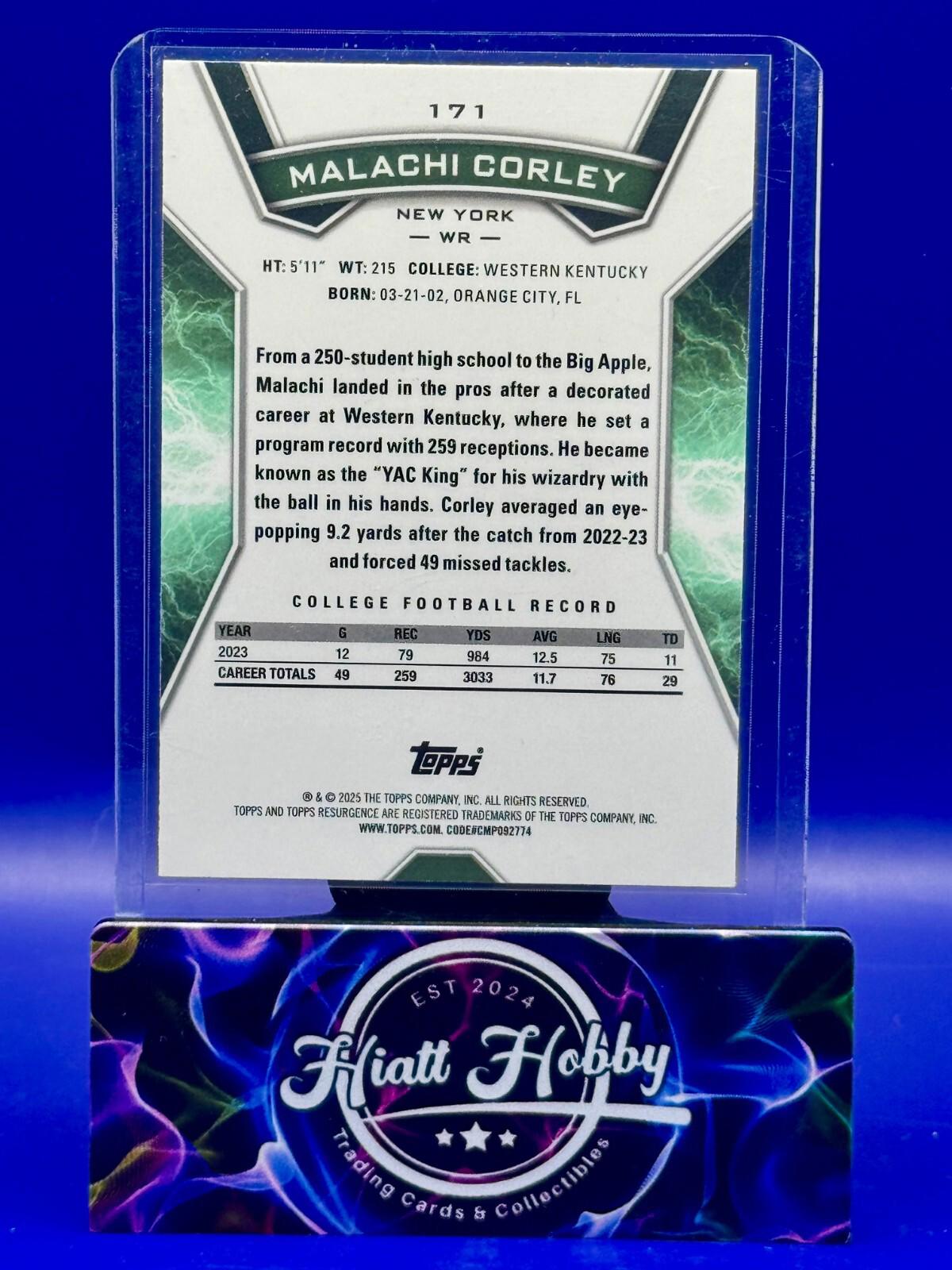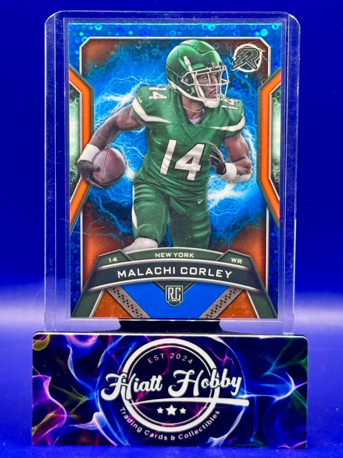 The 2024 Topps Resurgence - Rookies Malachi Corley #171 - Blue & Orange Spark trading card is a standard-sized sports collectible featuring the rookie player Malachi Corley from the New York Jets in the NFL. Manufactured by Topps in 2025, this original card is made of card stock and includes a parallel variety with a blue and orange spark design. Perfect for football fans and collectors, this card celebrates the young athlete's entry into the league and is a valuable addition to any sports memorabilia collection.