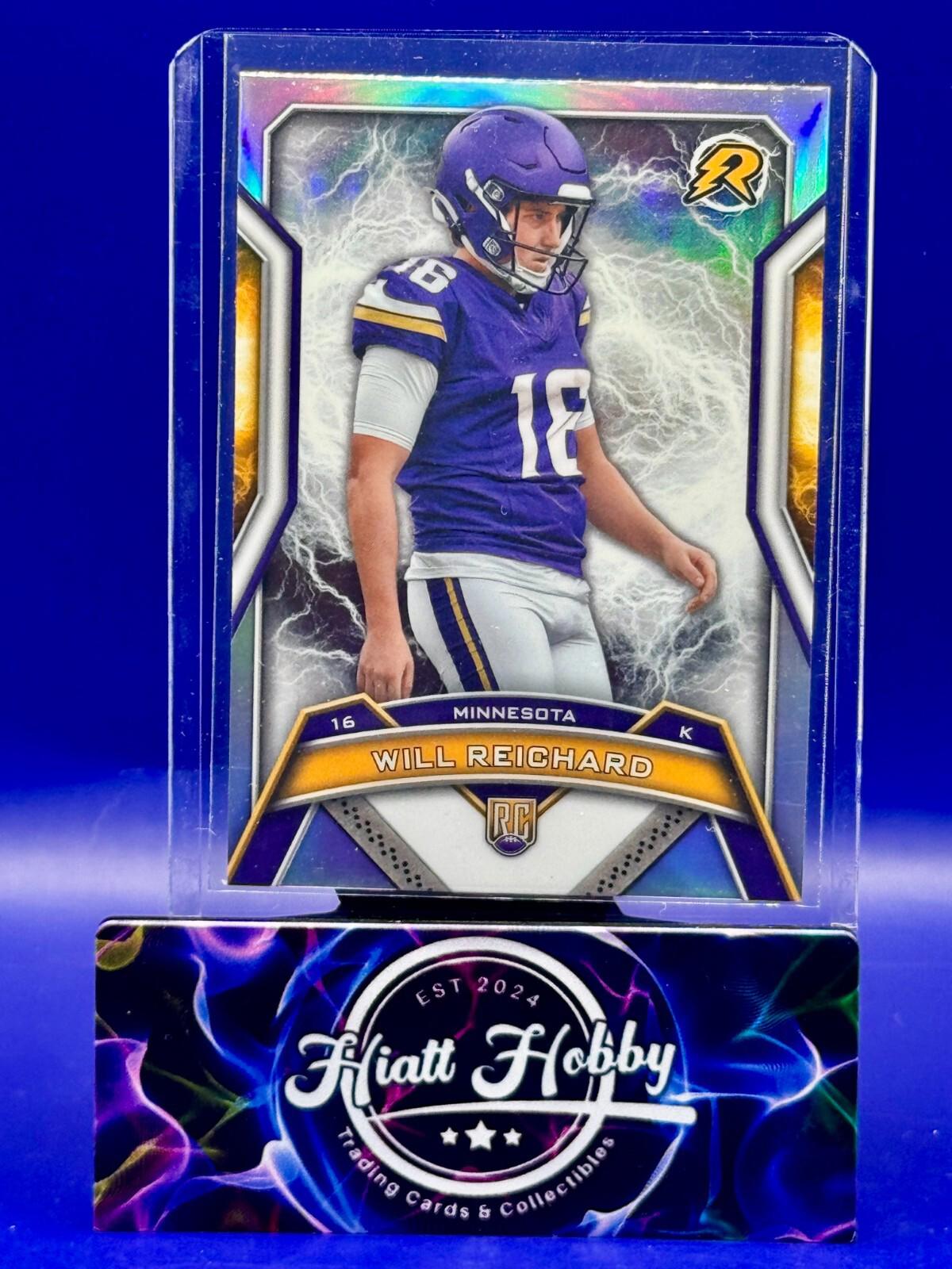 The 2024 Topps Resurgence - Rookies Will Reichard #163 Refractor trading card is an original card manufactured by Topps. This card features a parallel/variety design with a rookie player, Will Reichard, from the Minnesota Vikings. It is part of the 2024 Topps Resurgence set, showcasing athletes from the National Football League (NFL) in English language. This sports trading card is made of card stock and is not autographed, making it a valuable addition to any football card collection. Please Read: SHIPPING SCHEDULE We make every attempt to ship your item out quickly.  Our standard shipping schedule is Tuesday, Thursday, and Saturday drops at the post office and we include all items that have been paid for up to 5PM central the day prior.  That is, all purchases that have been paid for by 5PM central on a Monday will be included in the Tuesday shipment.  If the payment is received after the 5PM deadline, it will be part of the Thursday order drop. SHIPPING DETAILS Cards and Magazines are shipped out in padded or rigid envelopes and/or inserts to protect the item.  Individual cards are typically are shipped in a semi rigid card protector and a penny sleeve.  Combined orders will be packaged securely, but may not have a semi-rigid card protector (item will still be well protected) . Larger items are boxed up properly. We cannot control the USPS or UPS when it comes to the timely delivery of an item, their methods and handling of the item. Please DO NOT hold us responsible for the efforts of a delivery service, however, if you suspect damage to the package, please take pictures prior to opening and record the opening.  This would help with any insurance claims and reimbursements. We offer eBay Standard Envelope Shipping for orders at or below $20.  If your order exceeds $20, you must select USPS Ground Advantage for shipping in order for the order to be processed. SHIPPING INSURANCE Any Items that exceed $100 will include additional handling charges.  This fee is to cover the cost of insuring the item during transit. INTERNATIONAL SHIPPING We are pleased to now offer international shipping! PICTURES All photos are of the item you are bidding on when bidding on single item listings and will not be swapped out for other versions. Items that have multiple quantities will be in similar or better condition. PICTURES For listings that do not have variations, the card depicted in the photo is the card you will receive.  In cases that the listing has variations, the card may not be the same, but each card is inspected to ensure the same level of condition. MULTIPLE PURCHASES When purchasing multiple item from us, please wait to discuss before paying.  We will combine shipping for you and try to save some money. RATINGS & FEEDBACK If you have an issue with something, please try and contact us first so that we may try and work it out. If we come to a satisfactory conclusion, please consider providing a favorable review and positive feedback. Thank you so much for any business that you do with us.