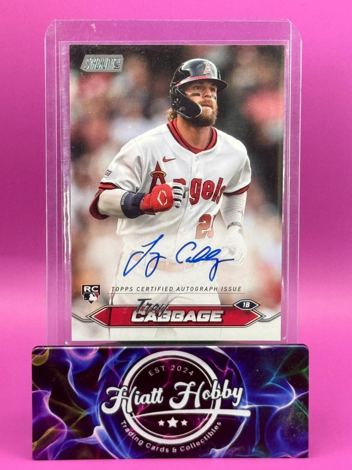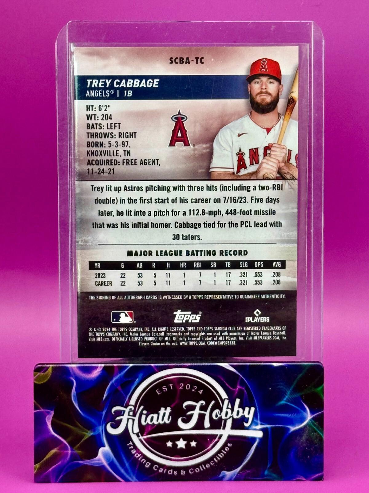 The product is a 2024 Topps Stadium Club autographed sports trading card featuring Trey Cabbage, a rookie player from the Los Angeles Angels. The card is signed by Trey Cabbage in a hard-signed format and is authenticated by Topps. This original card is part of the Major League Baseball (MLB) league, specifically designed for the 2024 MLB World Series. Made in the United States, this standard-sized card is a valuable collectible for baseball fans and collectors alike.