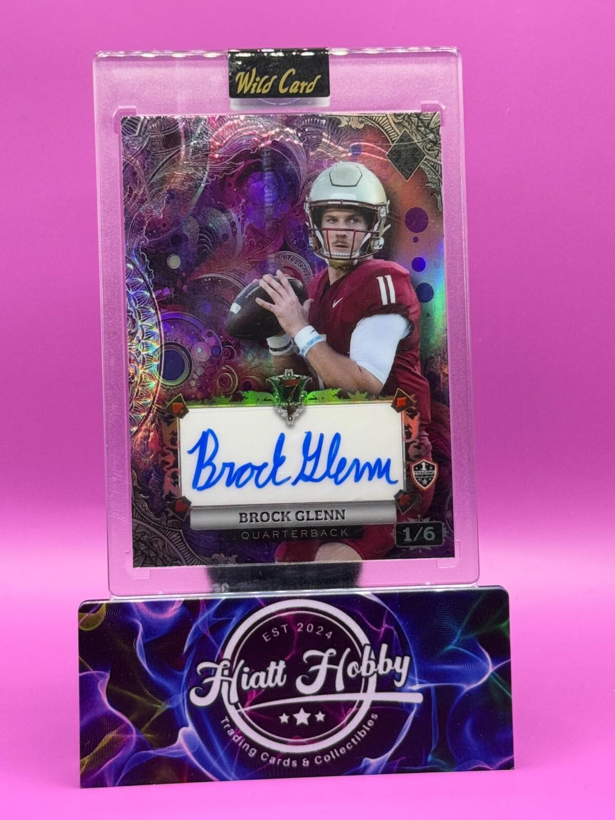 Capture a piece of sports memorabilia with the 2024 Wild Card 7-Card Stud High Stakes card featuring Brock Glenn. As a standout collectible, this card showcases the Florida State Seminoles quarterback in his rookie season, highlighted by the striking Purple Rainbow parallel. Its rarity is further accentuated by the serial number, indicating this is the one-sixth (1/6) edition, a must-have for serious collectors.The card, numbered AD7CF-BG, comes with an authentic autograph from Brock Glenn, certified via label or sticker, adding a personal touch and increasing its value. Proudly manufactured in the United States and presented in standard card size, this piece is an exceptional find for fans of football and the NCAA, or anyone appreciating the art of sports trading cards.
