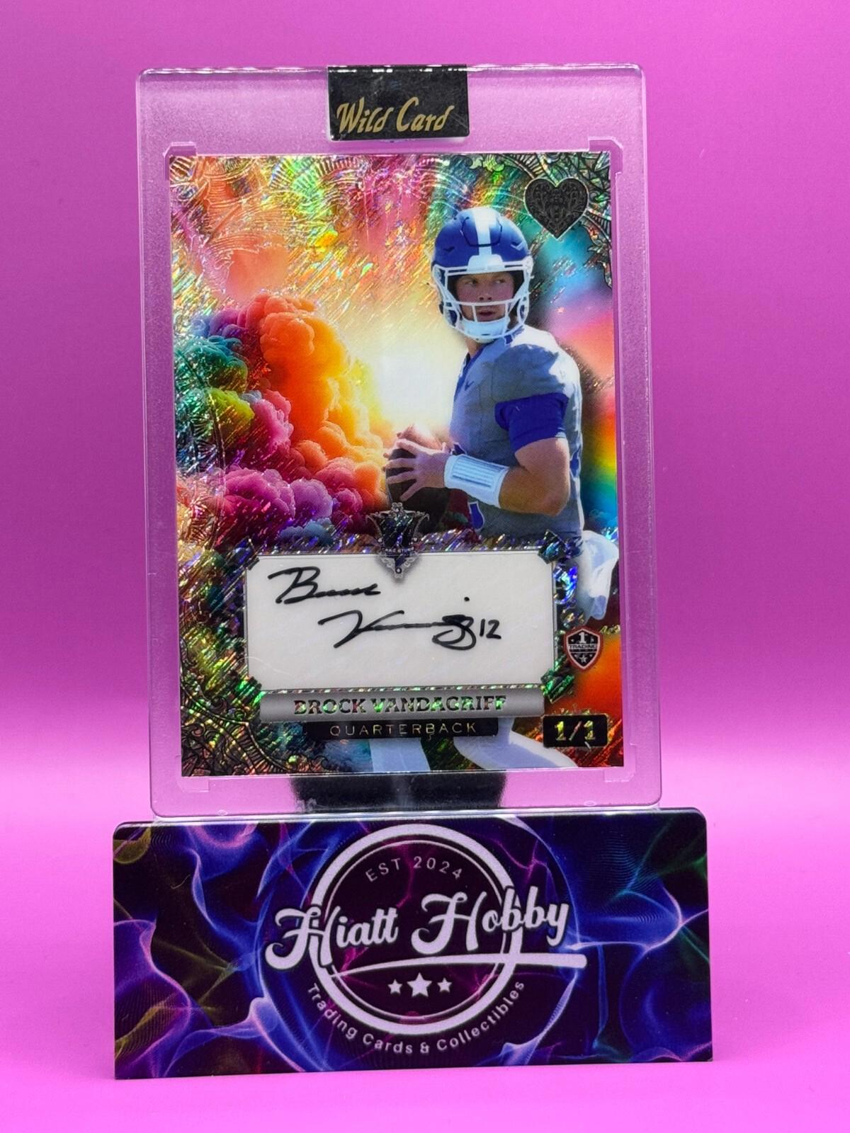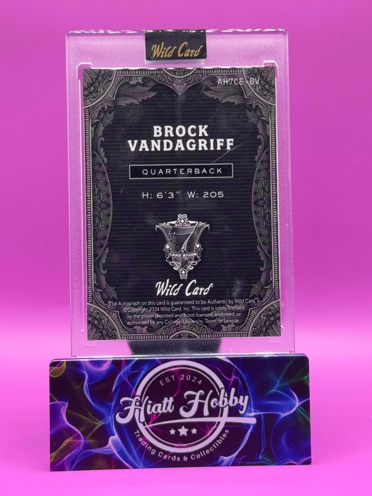 This 2024 Wild Card 7-Card Stud High Stakes sports trading card features Brock Vandagriff of the Kentucky Wildcats football team. The card is autographed by Vandagriff and signed with a label or sticker. It is a one-of-a-kind card with a Rainbow Shimmer parallel/variety and a print run of one. In addition, the card is serial numbered and marked as a rookie. It is a short print card and a member of the National Collegiate Athletic Association (NCAA). The card is in English and was manufactured in the United States.