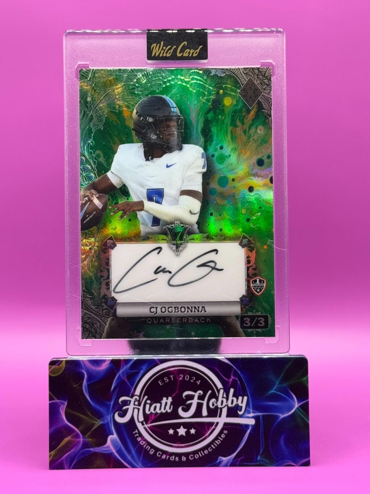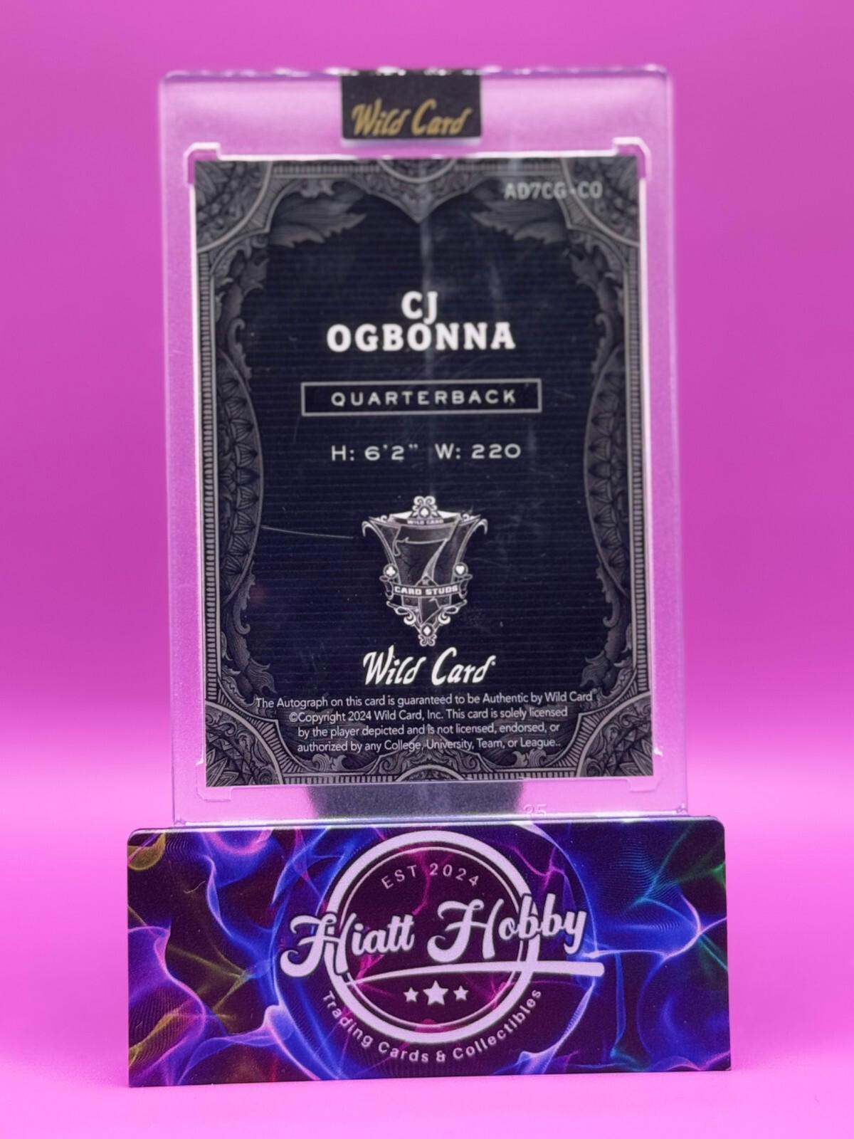 Enhance your sports card collection with the 2024 Wild Card 7-Card Stud High Stakes CJ Ogbonna card, numbered AD7CG-CO. This limited edition collectible features the talented football player from the Buffalo Bulls, capturing the spirit and excitement of the game. With its striking Green Rainbow parallel variety, this card is a visually stunning piece that stands out.Not only is it a rookie card, but it also comes with an autograph from CJ Ogbonna himself, authenticated with a label or sticker for complete trust in its origin. Only 3 of these cards exist, making it a rare and valuable addition. Proudly manufactured in the United States, this card celebrates the 2024 season and is a must-have for NCAA memorabilia enthusiasts.