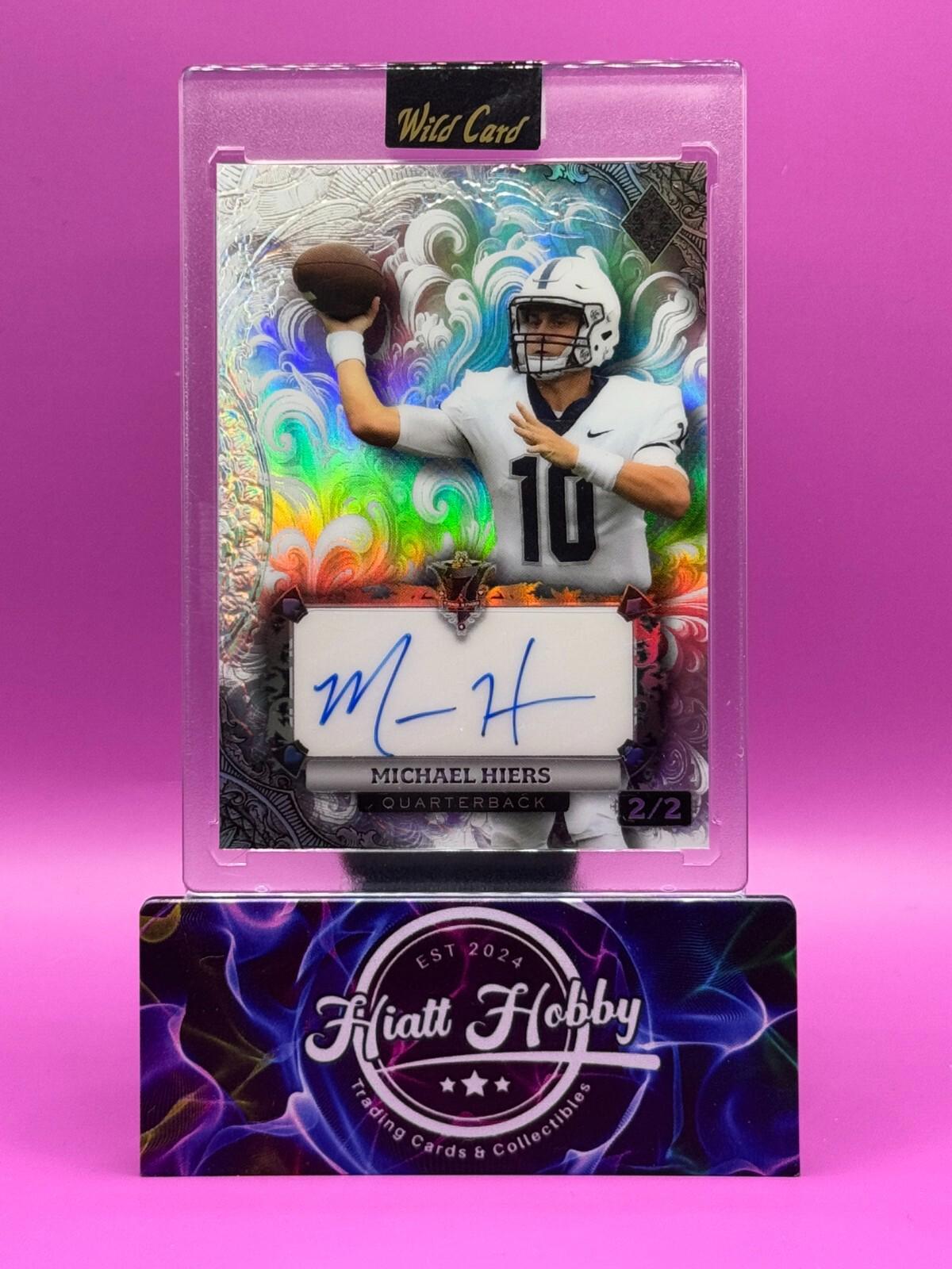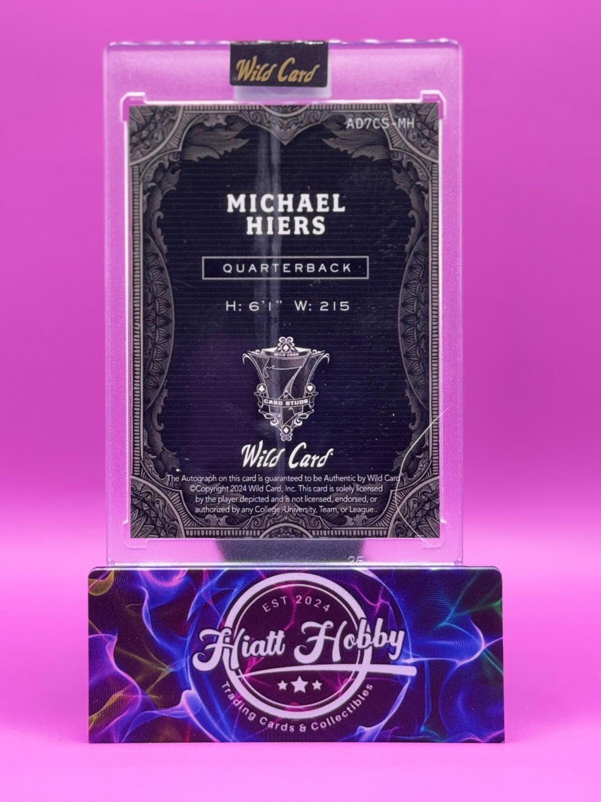 Elevate your sports card collection with the 2024 Wild Card 7-Card Stud High Stakes Michael Hiers card, numbered AD7CS-MH. This collectible features the promising Samford Bulldogs football player in an eye-catching White Rainbow parallel. As a rookie card, it's a cherished piece for enthusiasts looking to capture the beginnings of a potential football star's professional journey.The card is autographed by Michael Hiers himself, adding a personal touch that enhances its value. With a limited print run of just 2, this serial-numbered treasure is a rare find. The card is presented in standard size, manufactured in the United States, and includes features such as the NCAA league association, making it a standout addition to any collection.