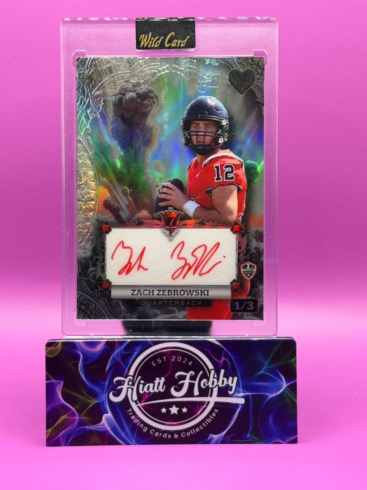 Capture a piece of football history with the 2024 Wild Card 7-Card Stud High Stakes card featuring standout player Zach Zebrowski. This card, numbered AH7CE-ZZ, boasts a striking Silver Rainbow parallel that sets it apart from the ordinary. As a rookie card, it's an essential collectible for fans and collectors alike, representing Zebrowski's exciting entry into the football world.Autographed by Zach Zebrowski himself and affixed with a label or sticker, this card is further enhanced by its limited print run, with only three in existence. Serial numbered to ensure its uniqueness, this card from the National Collegiate Athletic Association (NCAA) is a testament to Zebrowski's potential and a cherished piece for any collection.
