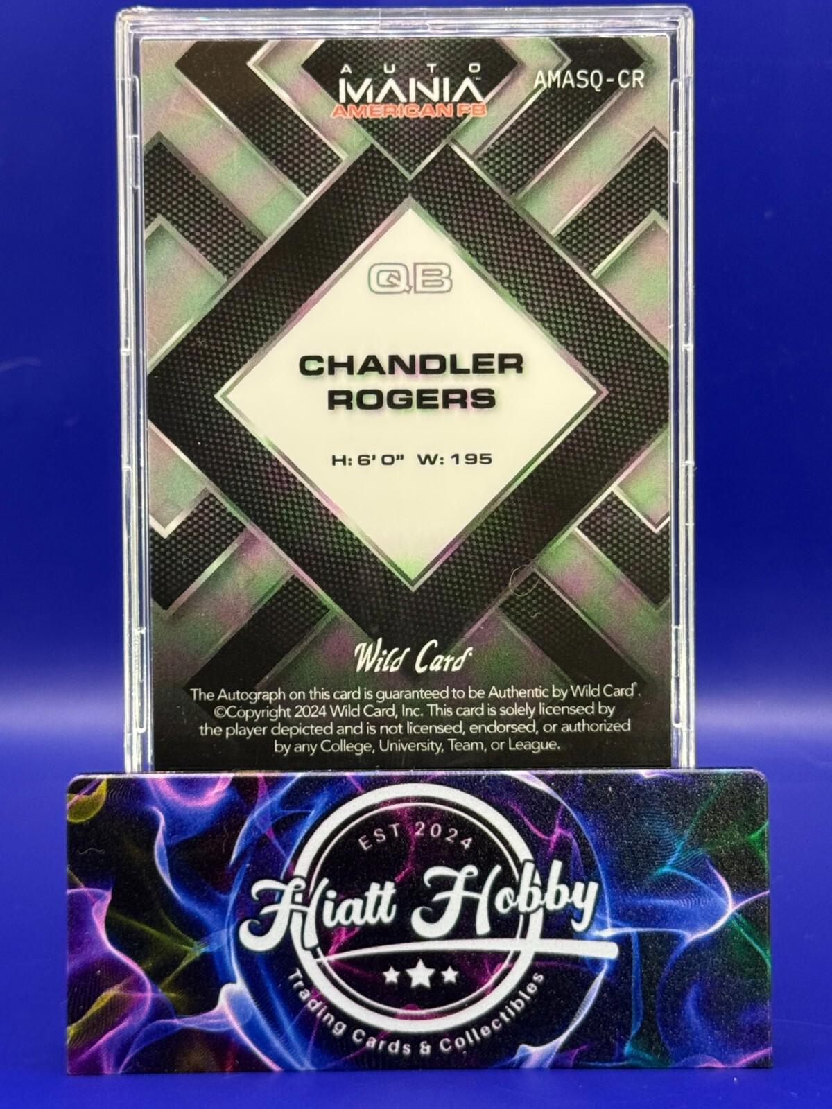 Capture a piece of football history with the 2024 Wild Card Auto Mania card featuring Chandler Rogers. This collectible card, numbered 25/25, is a unique find for enthusiasts and fans of the California Golden Bears. It boasts a striking rainbow foil design that sets it apart from the standard memorabilia.Autographed by Chandler Rogers himself, the card is authenticated with a label or sticker, ensuring its legitimacy and value. This rookie card, part of the Wild Card series, is a must-have for NFL collectors, especially with its serial numbering and short print status. It's a contemporary piece that celebrates both the player and the sport in a memorable way.