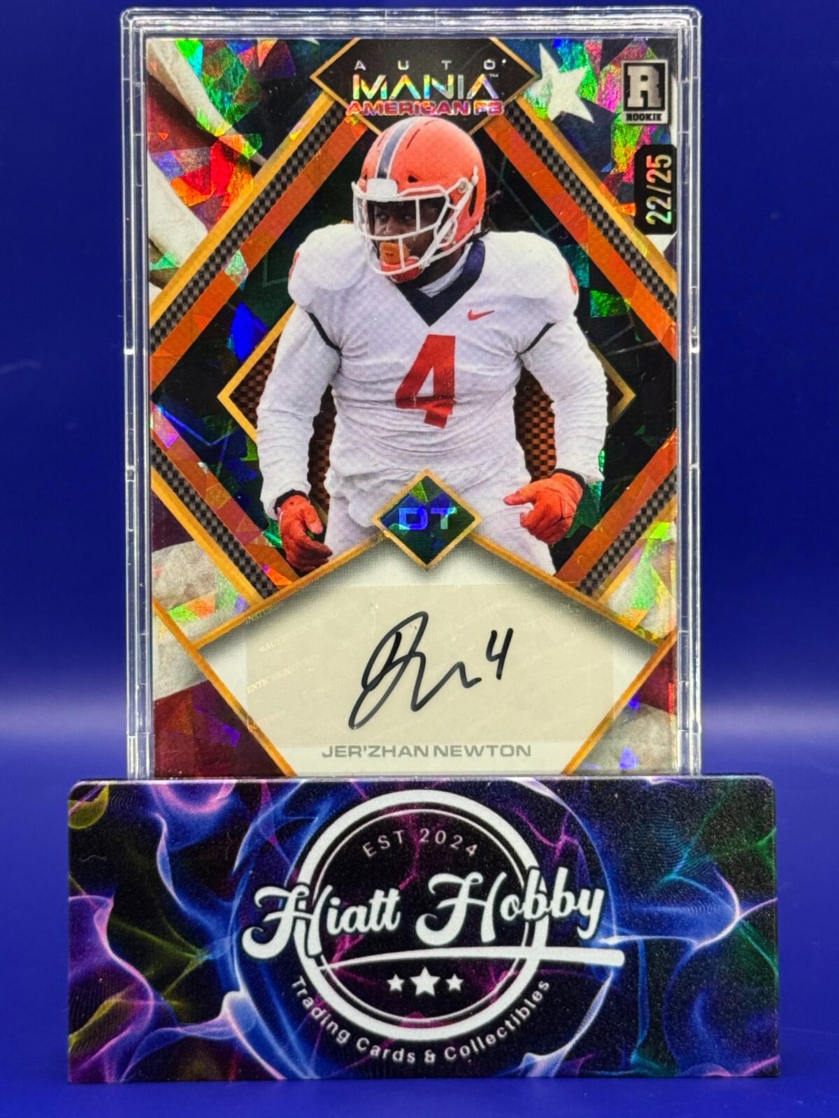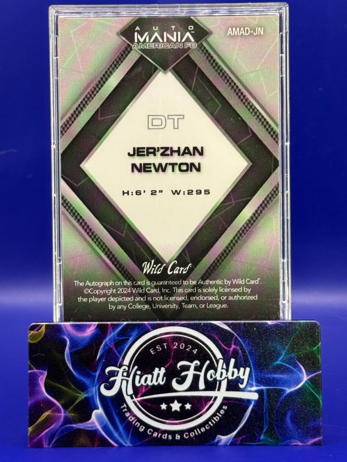 Capture the excitement of the gridiron with the 2024 Wild Card Auto Mania card featuring up-and-coming star Jer'zhan Newton of the Washington Commanders. This collectible is a tribute to American football and is a must-have for fans and collectors alike. The card is adorned with an eye-catching American flag design and is part of a limited print run of just 25, making it a rare and special addition to any collection.Autograph collectors will be delighted to find that this card is not only signed by Jer'zhan Newton himself but also comes with a serial number, ensuring its authenticity and exclusivity. The card is manufactured in the United States and comes in standard size, fitting seamlessly into any sports trading card collection. Don't miss the chance to own a piece of football history with this 2024 Wild Card Auto Mania collectible. Please Read: SHIPPING NOTE This Item will be placed in a semi-rigid card holder for shipping.  The chosen shipping method was chosen to minimize expense.  If you would like the card sent in the holder shown in the photographs, please reach out for a shipping upgrade prior to payment to see about making a shipping adjustment SCHEDULE We make every attempt to ship your item out quickly.  Our standard shipping schedule is Tuesday, Thursday, and Saturday drops at the post office and we include all items that have been paid for up to 5PM central the day prior.  That is, all purchases that have been paid for by 5PM central on a Monday will be included in the Tuesday shipment.  If the payment is received after the 5PM deadline, it will be part of the Thursday order drop. SHIPPING DETAILS Cards and Magazines are shipped out in padded or rigid envelopes are shipped in a semi rigid card protector and a penny sleeve. Larger items are boxed up properly. We cannot control the USPS or UPS when it comes to the timely delivery of an item, their methods and handling of the item. Please DO NOT hold us responsible for the efforts of a delivery service, however, if you suspect damage to the package, please take pictures prior to opening and record the opening.  This would help with any insurance claims and reimbursements. For Orders Exceeding $20, you must select USPS Ground Advantage for shipping in order for the order to be processed. INTERNATIONAL SHIPPING We are not offering international shipping at this time. PICTURES All photos are of the item you are bidding on.  Your item will not be swapped out for a similar item. MULTIPLE PURCHASES When purchasing multiple item from us, please wait to discuss before paying.  We will combine shipping for you and try to save some money. RATINGS & FEEDBACK If you have an issue with something, please try and contact us first so that we may try and work it out. If we come to a satisfactory conclusion, please consider providing a favorable review and positive feedback. Thank you so much for any business that you do with us.
