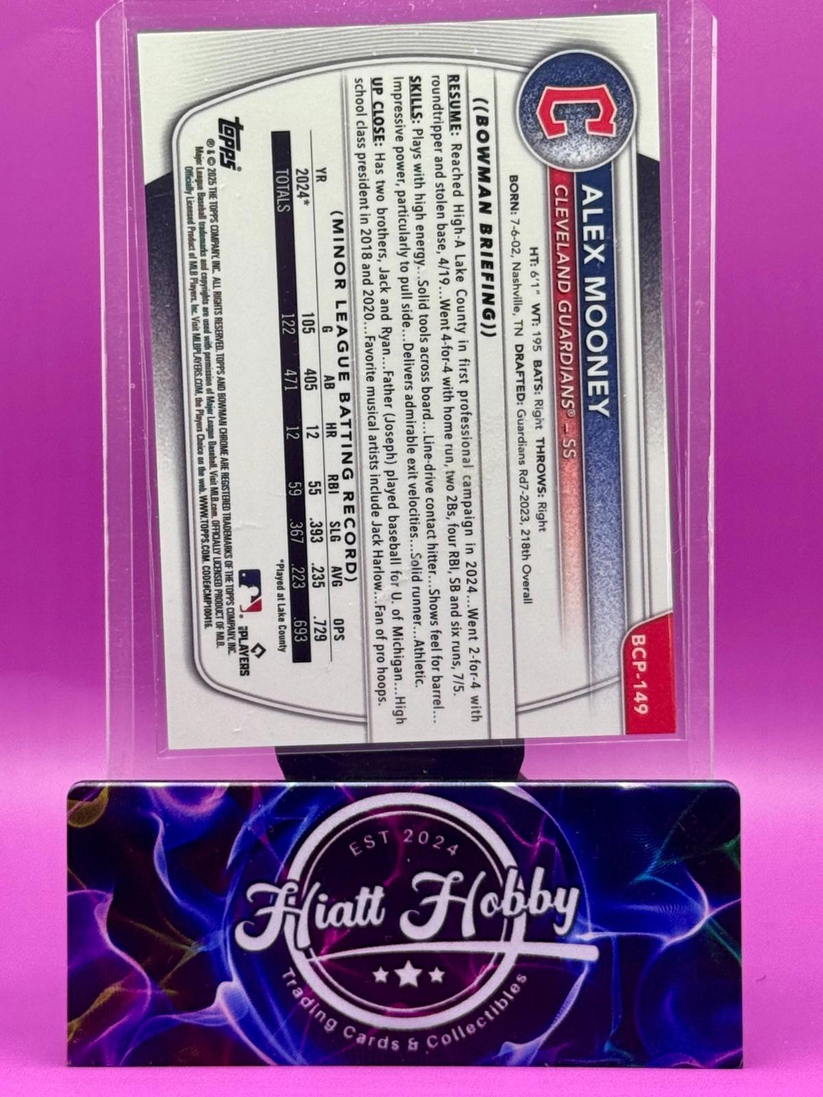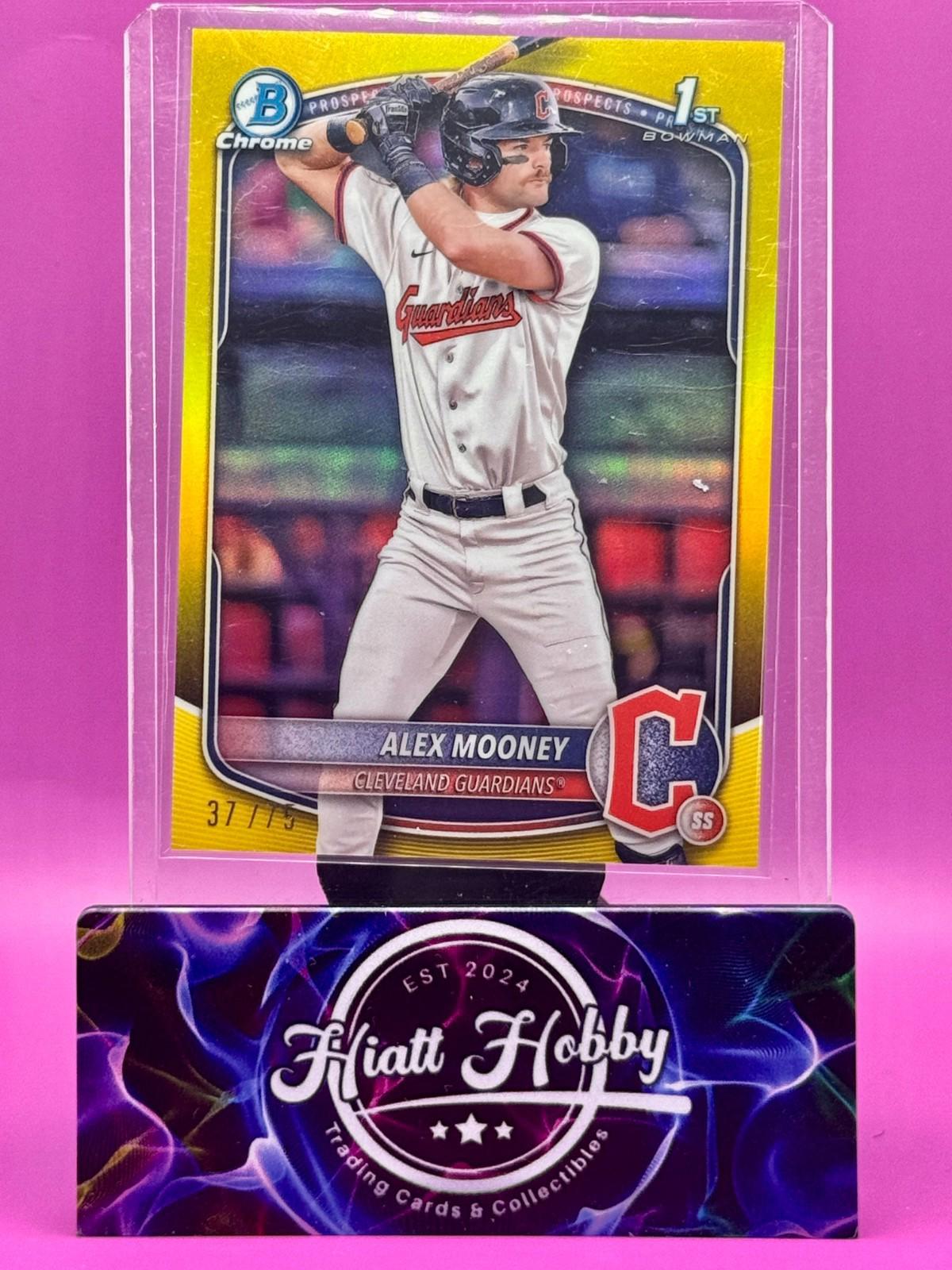 The 2025 Bowman Chrome Alex Mooney #BCP-149 Yellow Refractor /75 (RC) is a limited edition baseball trading card featuring a rookie player from the Cleveland Guardians. Made of card stock with a print run of only 75, this original Topps card is part of the Chrome Prospects insert set and is serial numbered for authenticity. The yellow refractor parallel adds a unique shine to the card, making it a sought-after collectible for baseball fans and card collectors alike.