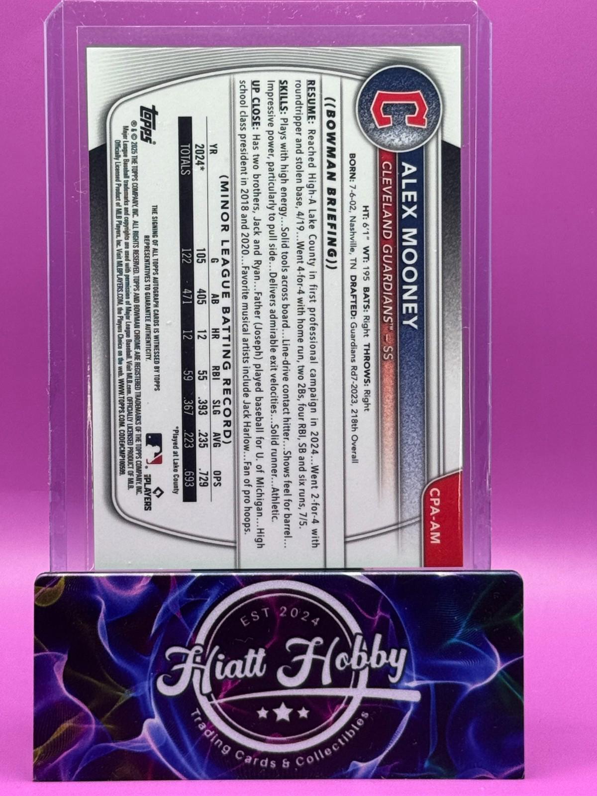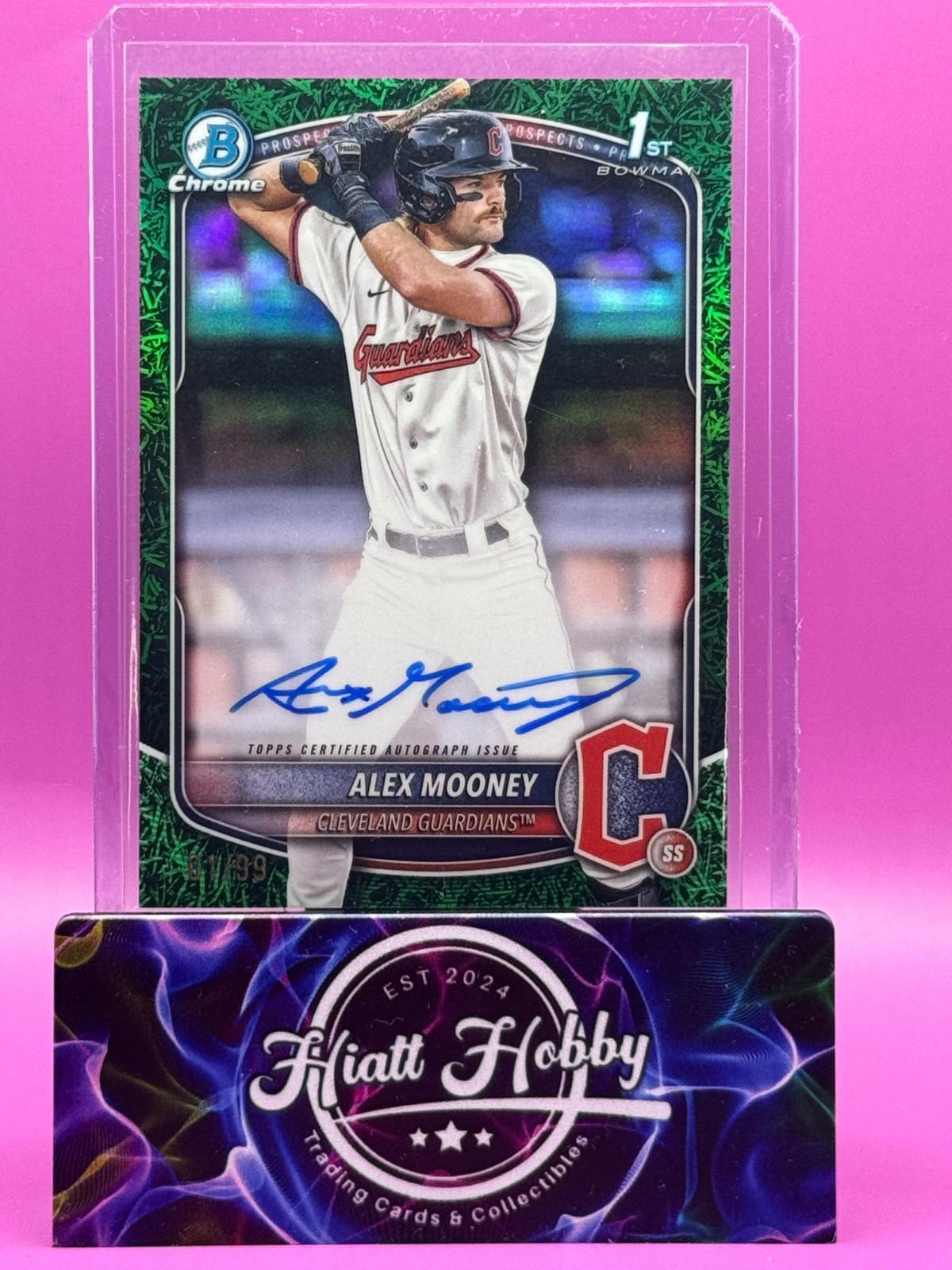 The product is a 2025 Bowman Chrome baseball trading card featuring an autograph from Alex Mooney, a player from the Cleveland Guardians. This card is a Green Refractor parallel, numbered to 99, and part of the Chrome Prospect Autographs insert set. Authenticated by Topps, this hard-signed autograph is a valuable addition to any sports card collection, especially for fans of MLB and rookie collectors. Made of card stock in the United States, this limited edition card is a prized piece for collectors looking for unique and rare sports memorabilia.