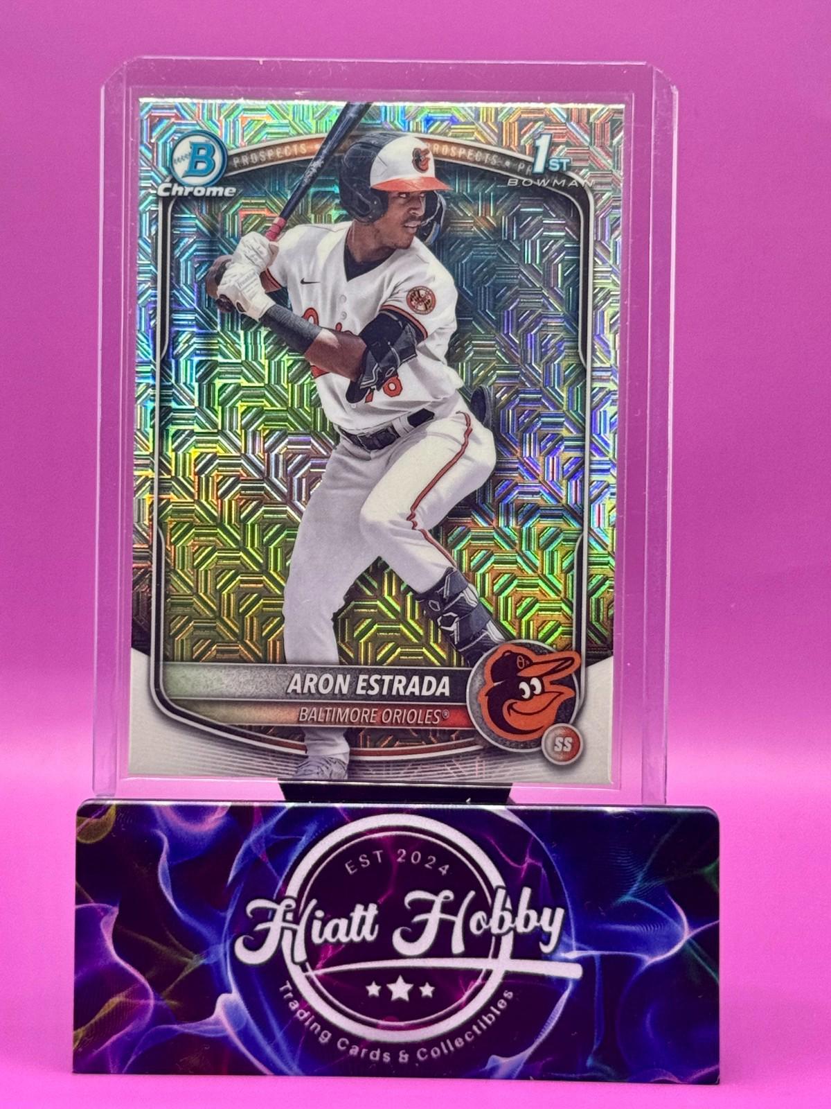 The 2025 Bowman Chrome Aron Estrada #BCP-33 Mojo Refractor trading card is a collectible item featuring the player Aron Estrada from the Baltimore Orioles. Manufactured by Topps in the United States, this original sports trading card belongs to the Chrome Prospects insert set for the 2025 baseball season. The Mojo Refractor parallel variety adds a unique and eye-catching design to this English-language card, which is not autographed and is part of the MLB World Series tournament.