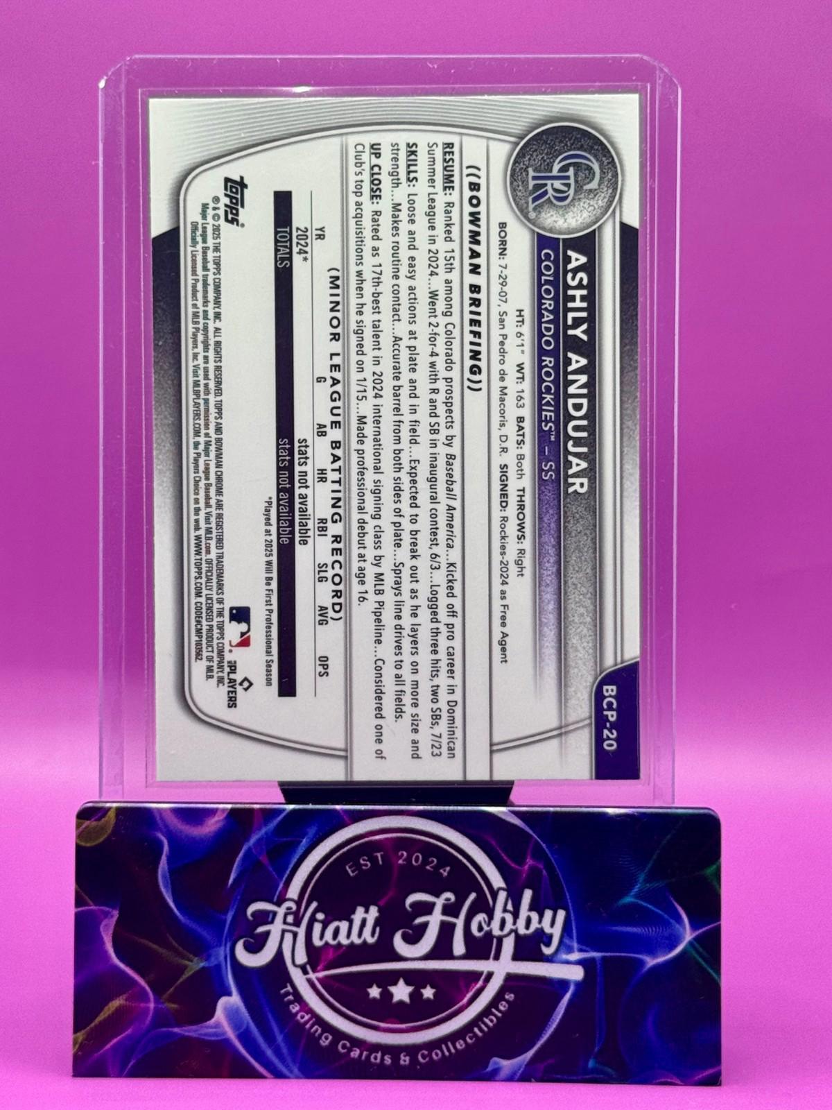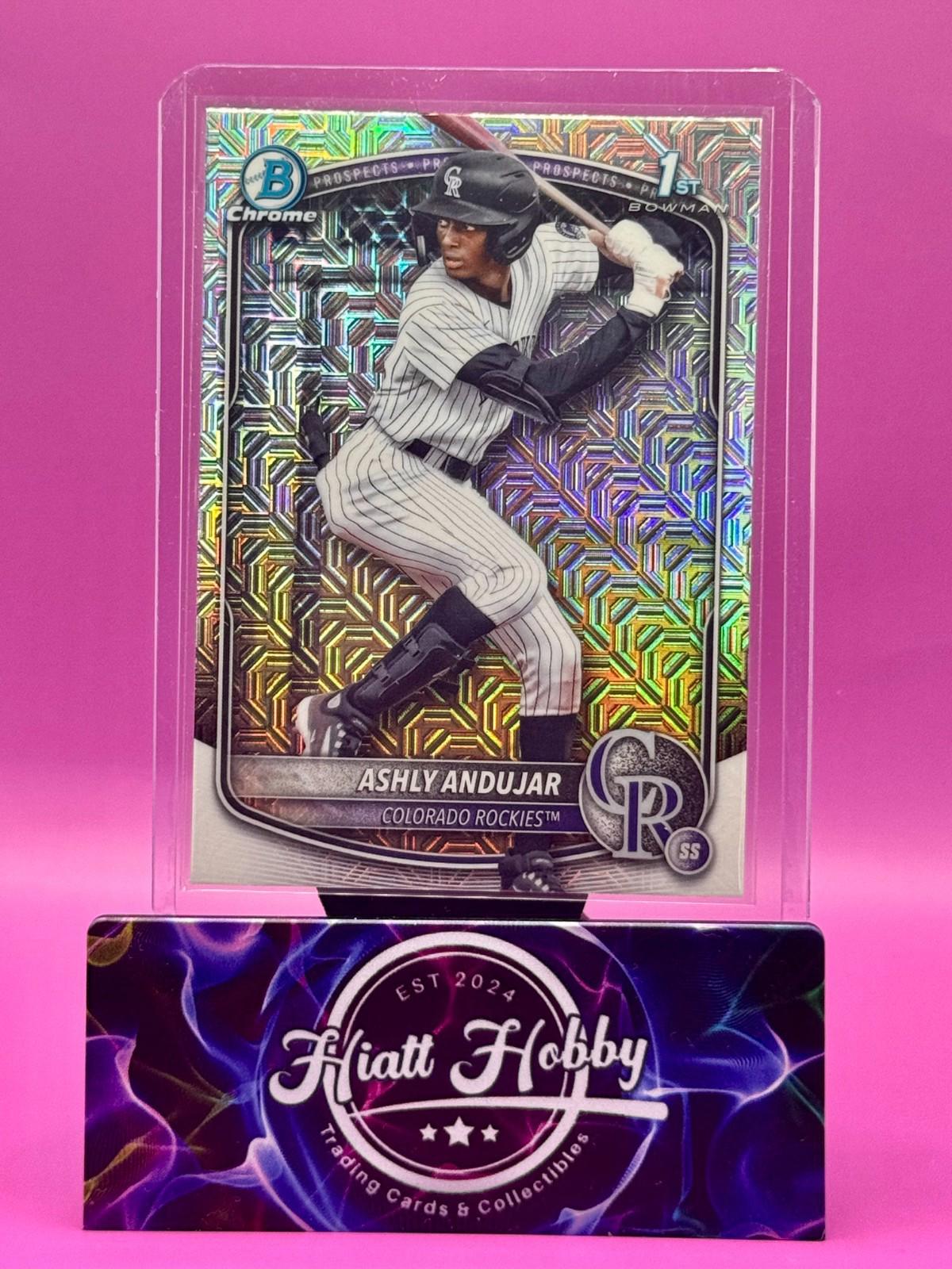 The 2025 Bowman Chrome Ashly Andujar #BCP-20 Mojo Refractor trading card is a highly sought-after collectible in baseball circles. Manufactured by Topps, this original card features a parallel variety design that sets it apart from the standard Bowman Chrome cards. With a focus on the Major League (MLB), this card showcases the young player from the Colorado Rockies and is a part of the Chrome Prospects insert set. While not autographed, this card is a valuable addition to any sports trading card collection, especially for fans of the MLB World Series and baseball enthusiasts.