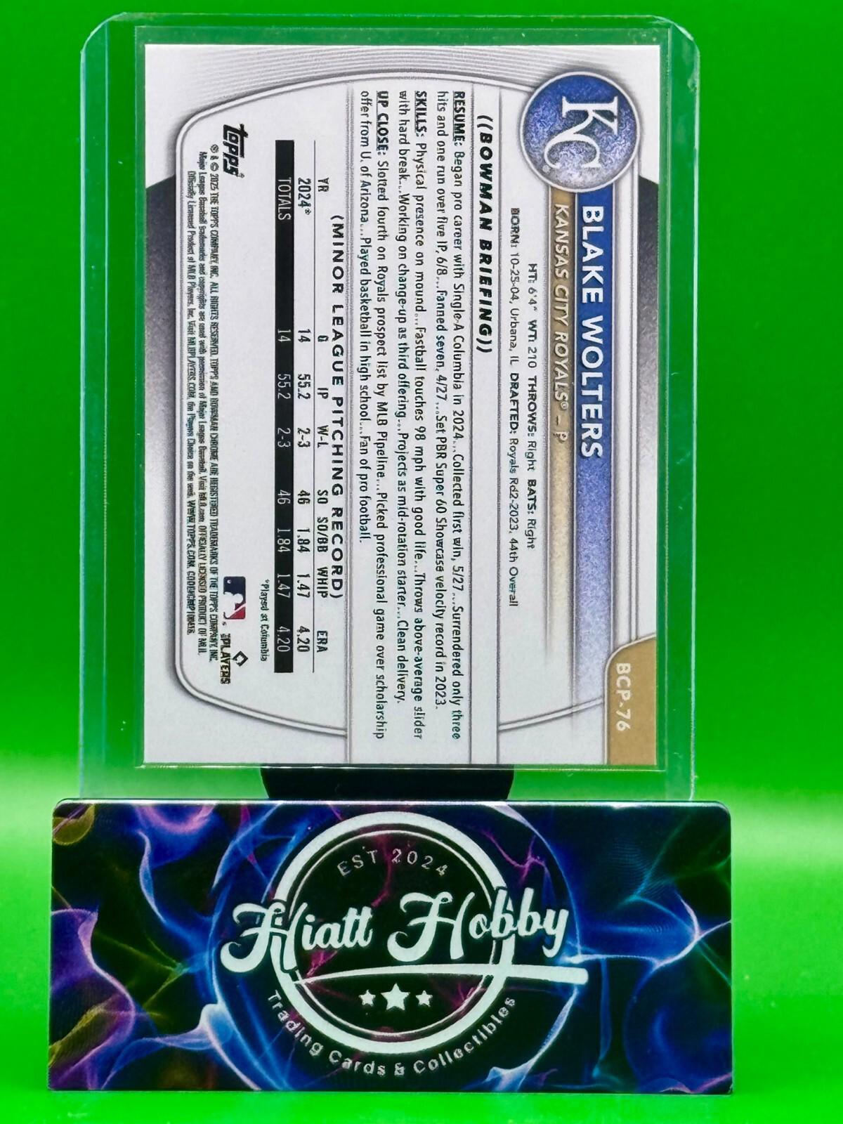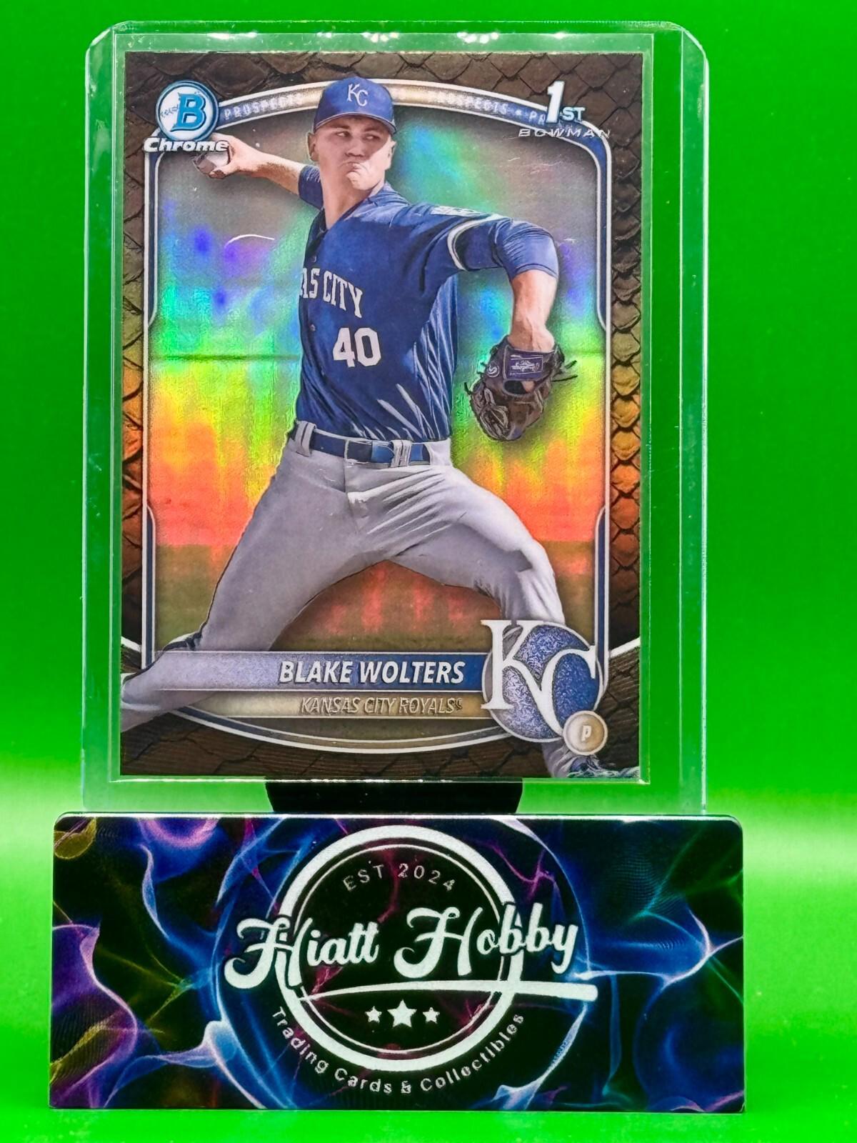 This 2025 Bowman Chrome sports trading card features Blake Wolters, a rookie player for the Kansas City Royals. The card is an original licensed reprint and is part of the Reptillian Refractor parallel/variety set. It is in near mint or better condition and is graded via the original listing. The card is in English language and is manufactured in the United States. The MLB World Series event/tournament is also mentioned in the description. This card is a great addition to any baseball fan's collection.