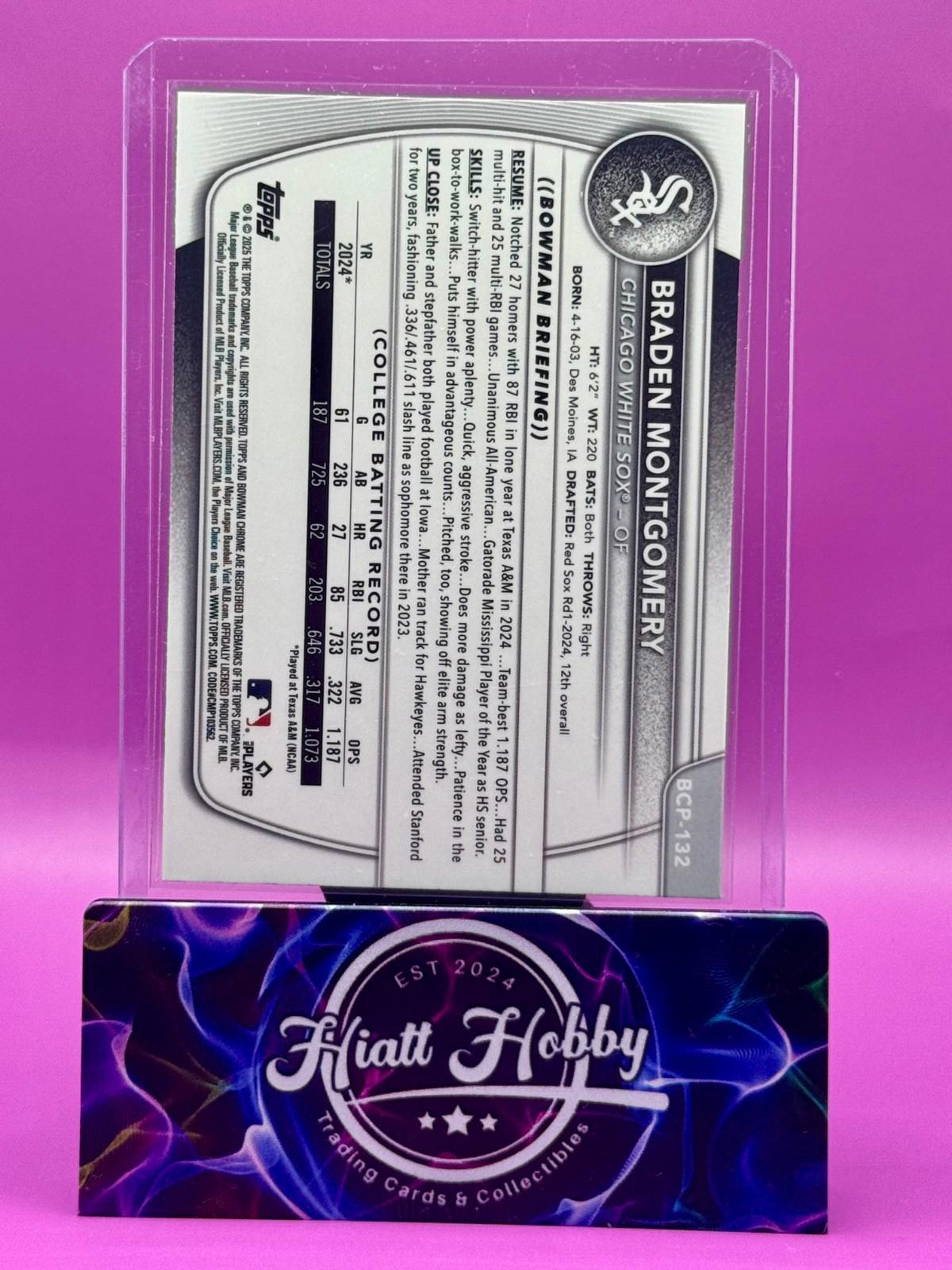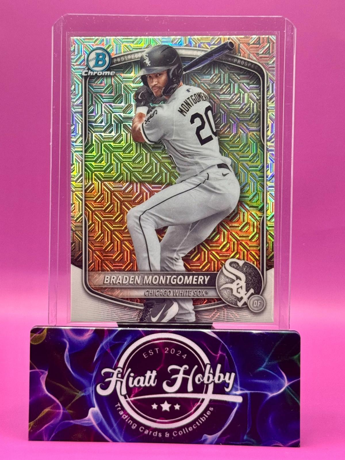 The product is a 2025 Bowman Chrome Braden Montgomery #BCP-132 Mojo Refractor trading card. Manufactured by Topps, this baseball card features a rookie player from the Chicago White Sox in the Major League (MLB). It is part of the Chrome Prospects insert set and is an original licensed reprint. With its unique Mojo Refractor parallel variety, this sports trading card is a valuable addition to any collector's set for the 2025 MLB World Series season.